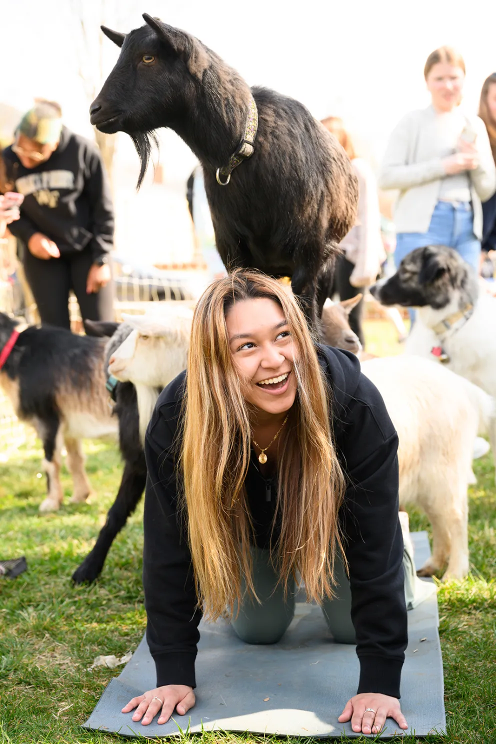 Students participate in Goat Yoga and Counseling Screenings on the Quad as part of Mental Health Week.
