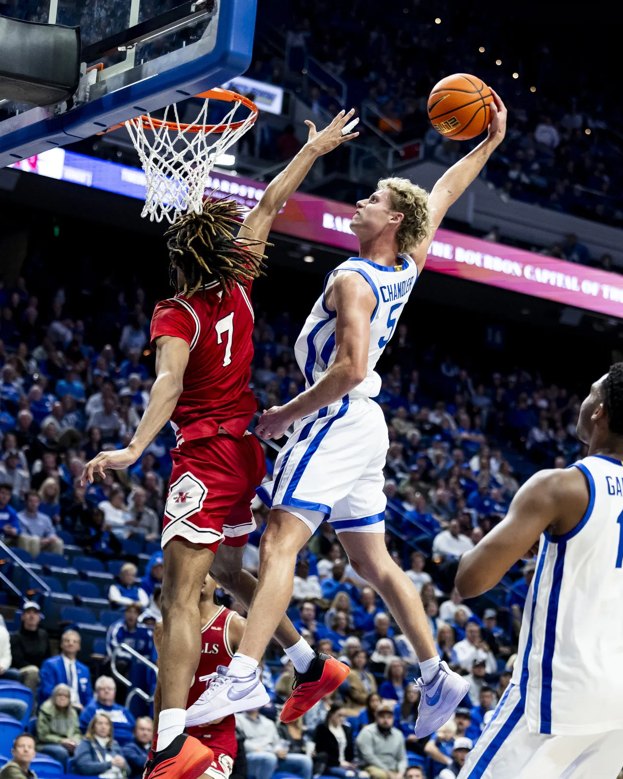 Kentucky’s Collin Chandler throws down a dunk over Nicholls State’s Grant Sanders during the second half of the Cats 77-51 win in Lexington’s Rupp Arena.
