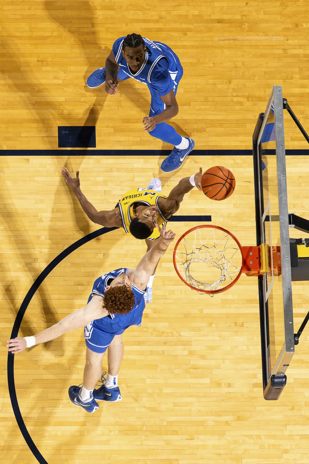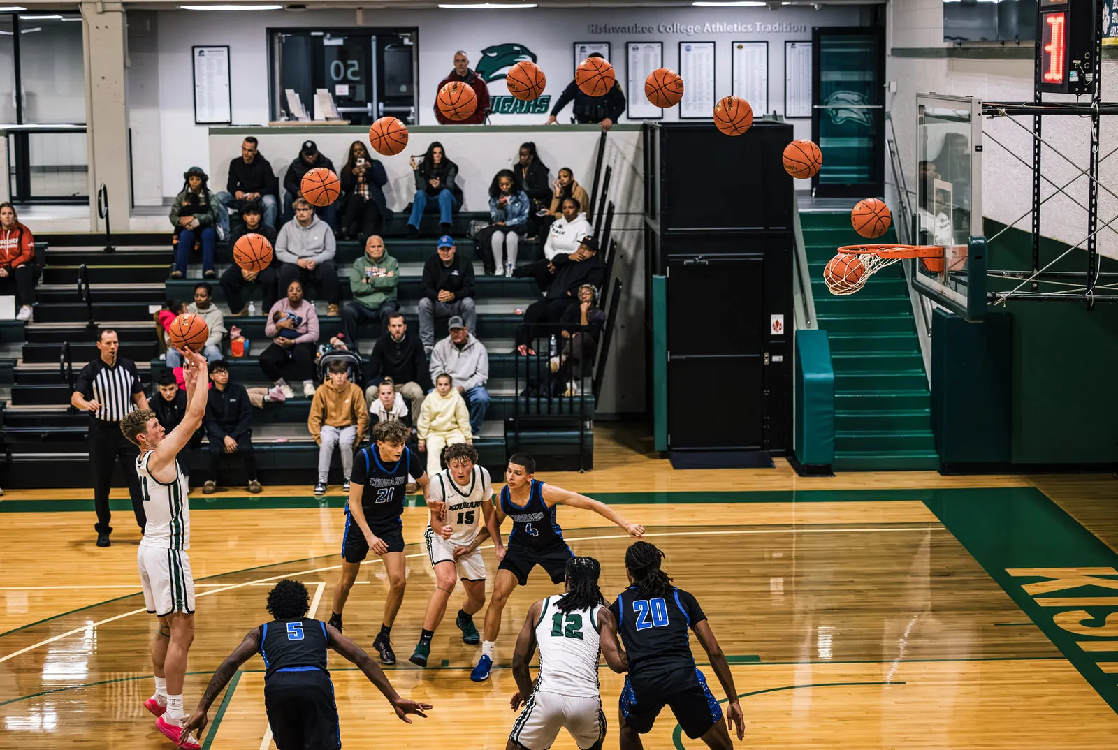 A burst of images taken during a single free throw composited into one photo to better illustrate the path the ball travels.