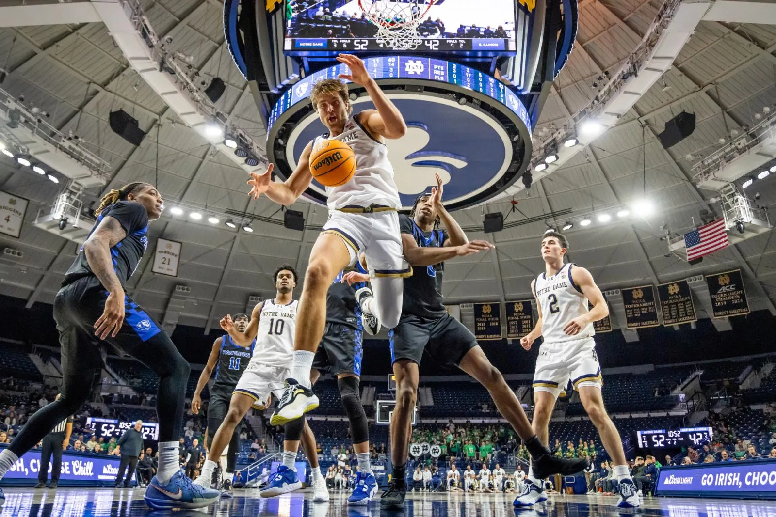 Fighting Irish forward Carson Towt (33) tries to grab a loose ball during a men’s basketball game against the Eastern Illinois Panthers.