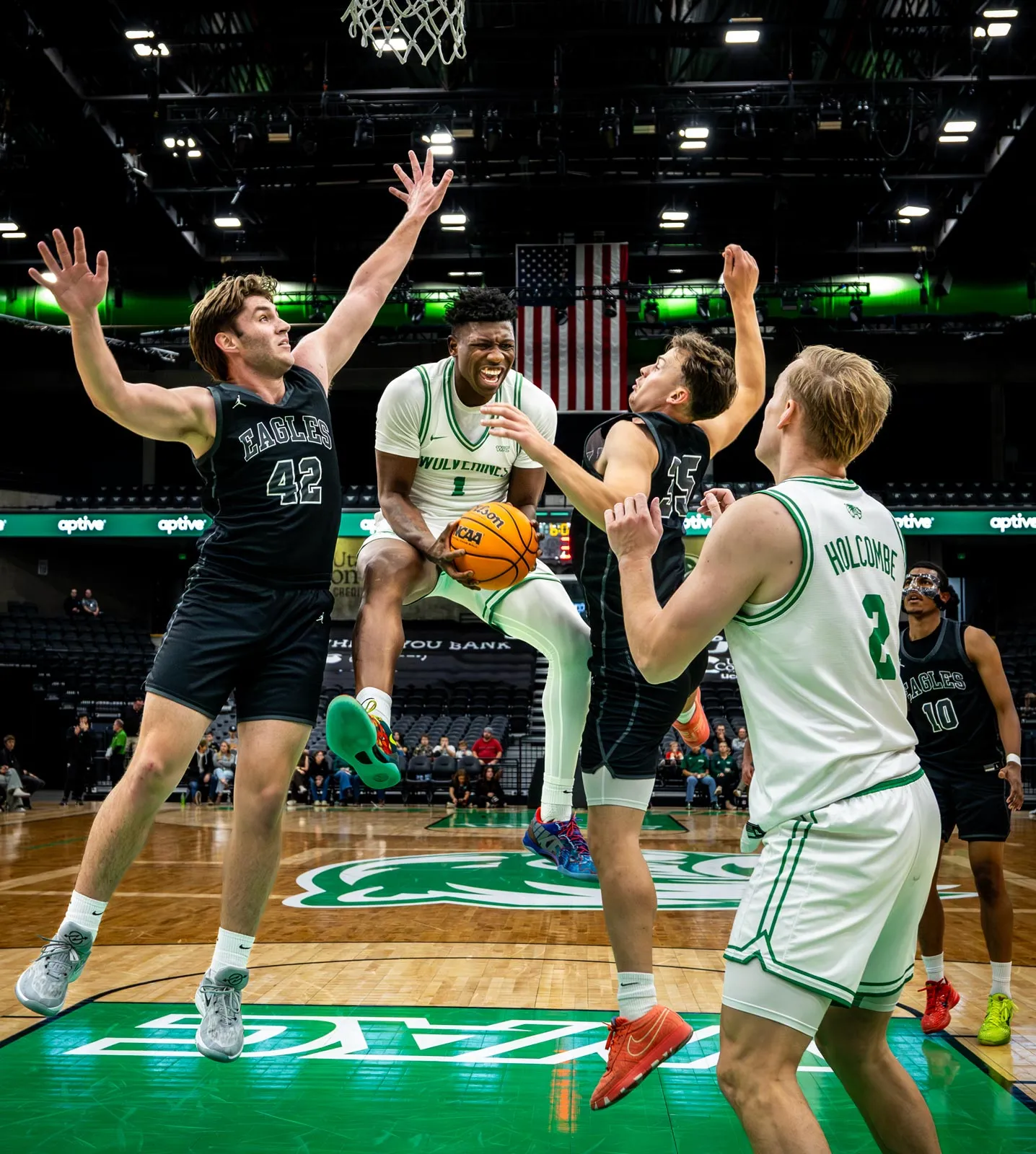 Isaac Davis (1) pulls down an offensive rebound against Zach Clay (42) and John Lawrenz (35) during the 116-35 home team route of the visiting West Coast Baptist Eagles.