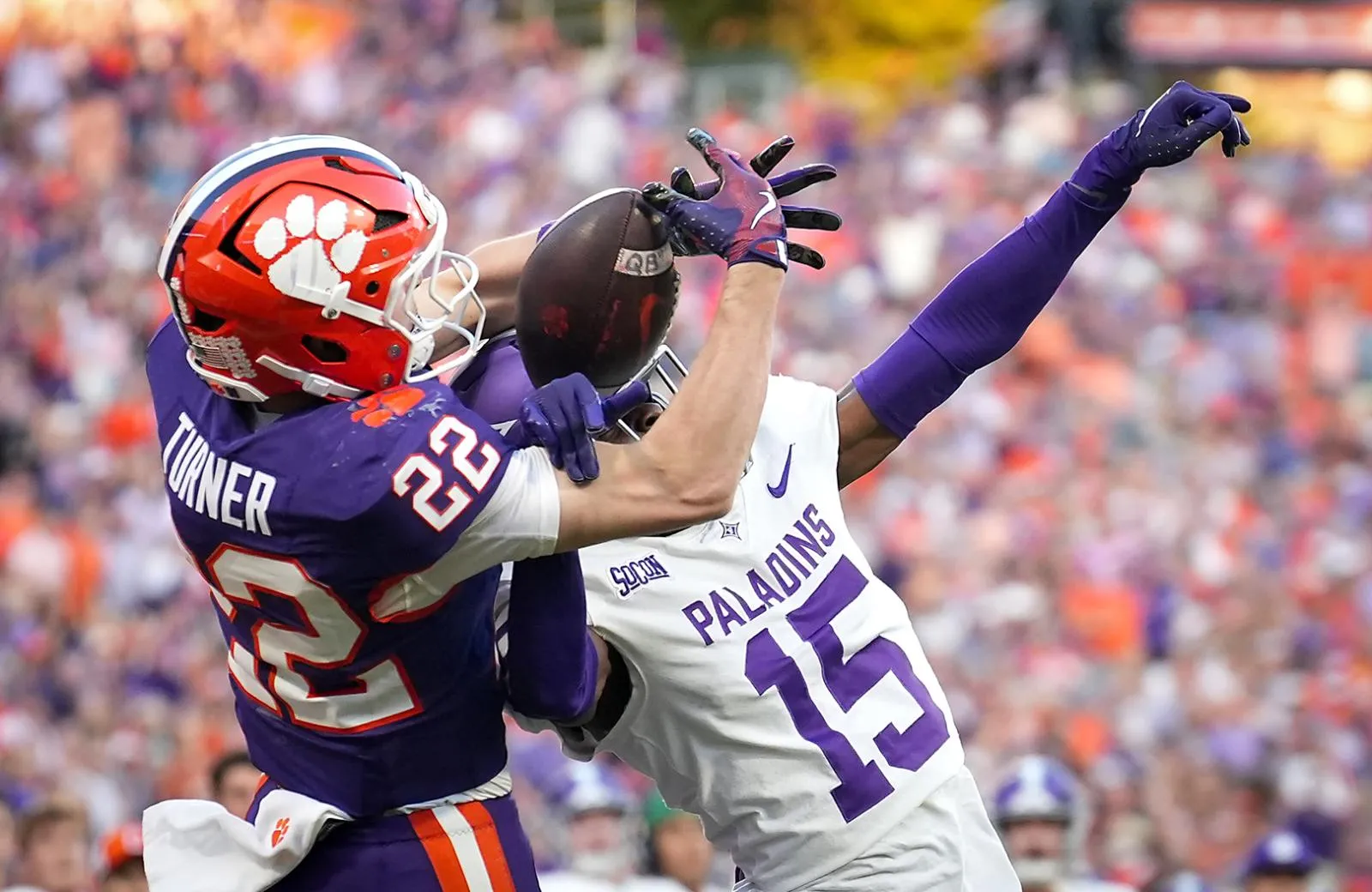 Furman cornerback Eddie Jackson III breaks up a pass intended for Clemson wide receiver Cole Turner in the first quarter of their game at Memorial Stadium on Saturday, November 22, 2025.
