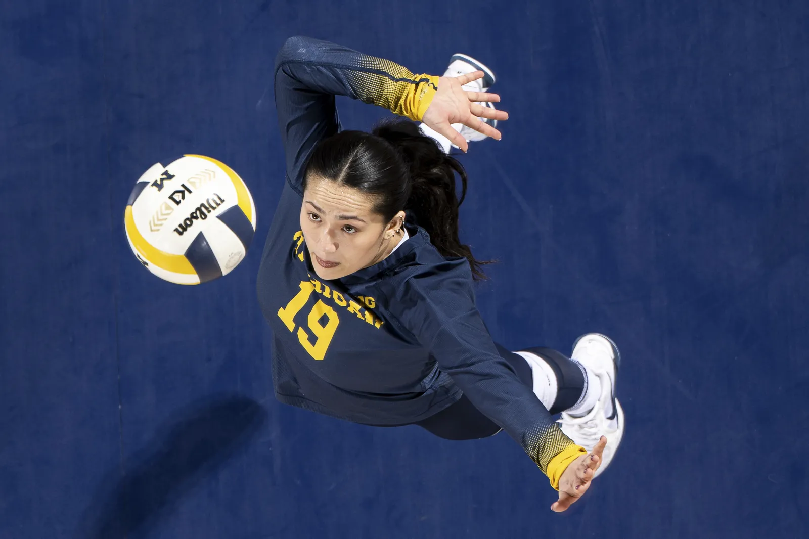 A Michigan volleyball player serves the ball against Michigan State.