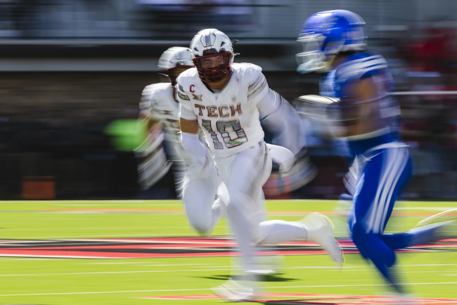 Texas Tech's Jacob Rodriguez (10) defends on a play against BYU during an NCAA college football game on Saturday, Nov. 8, 2025, in Lubbock, Texas.