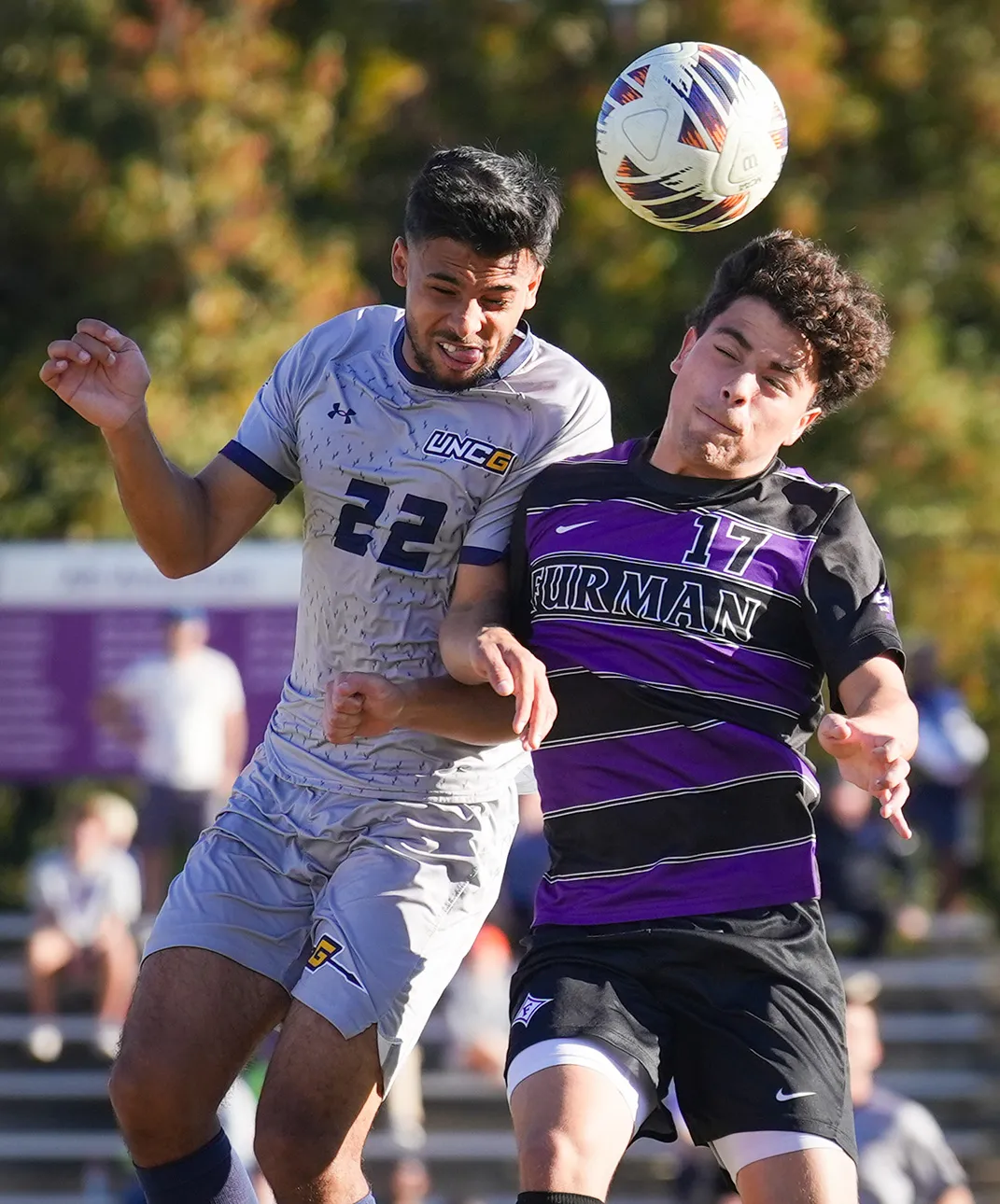 Furman’s Wilfer Bustamante, right, and UNC-Greensboro’s Sami Lachekar compete for a header in the second half of the SoCon Conference final at Stone Stadium on Sunday, November 16, 2025.