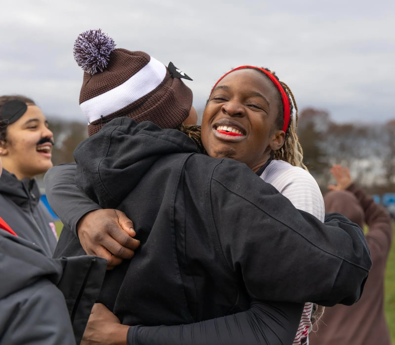 Imani Moneyang of the Brown Women's Rugby team celebrates with her teammates after scoring her first colliegate try at the Cianci 7s Tournament.