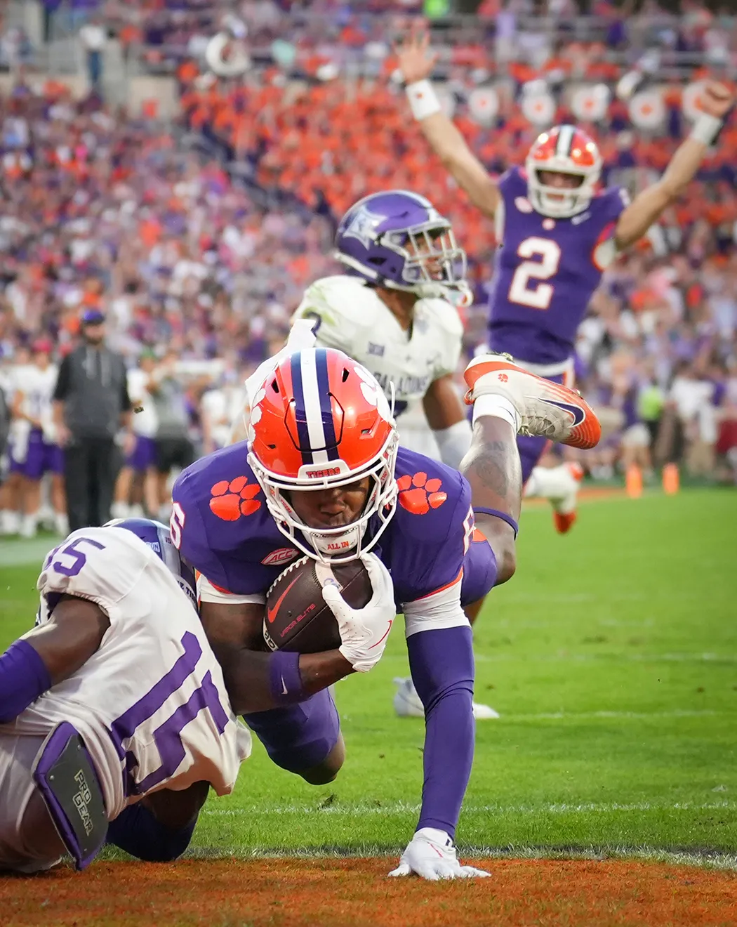 Clemson wide receiver Tyler Brown scores a touchdown past Furman cornerback Eddie Jackson III in the first quarter of their game at Memorial Stadium on Saturday, November 22, 2025.