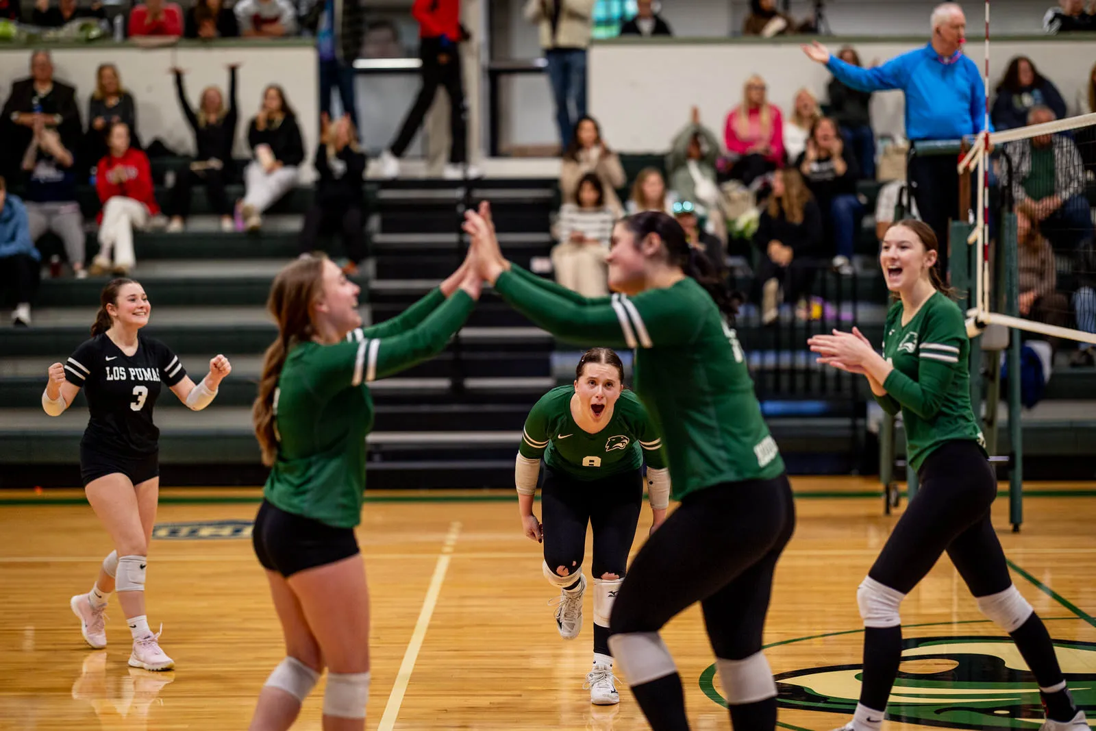 The Kishwaukee Volleyball team celebrates in their own ways after scoring a point.