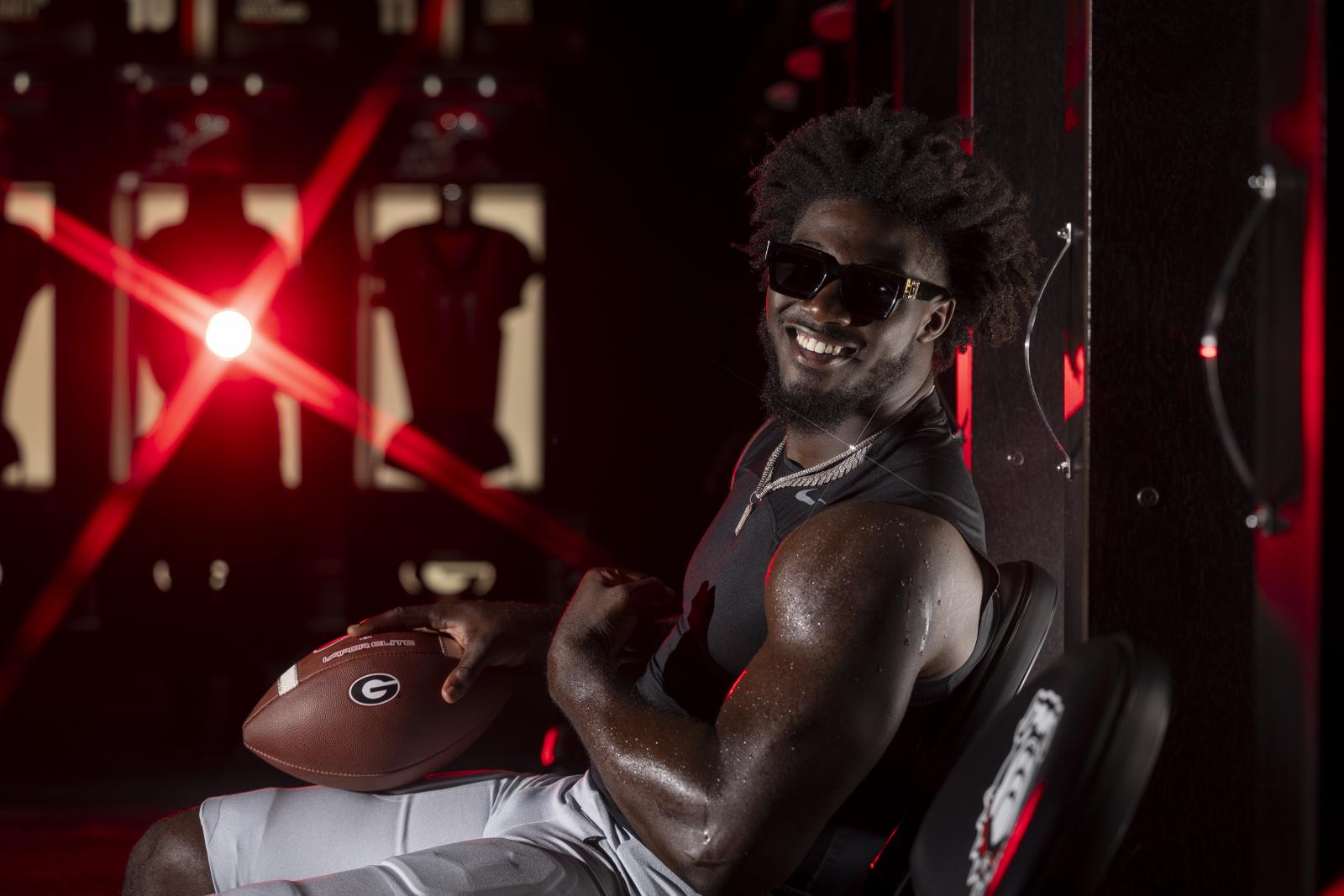 The future is bright for star linebacker Jalon Walker as his portrait is taken inside the Georgia locker room before the start of the 2024 football season.