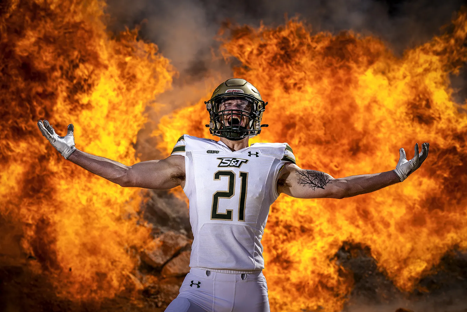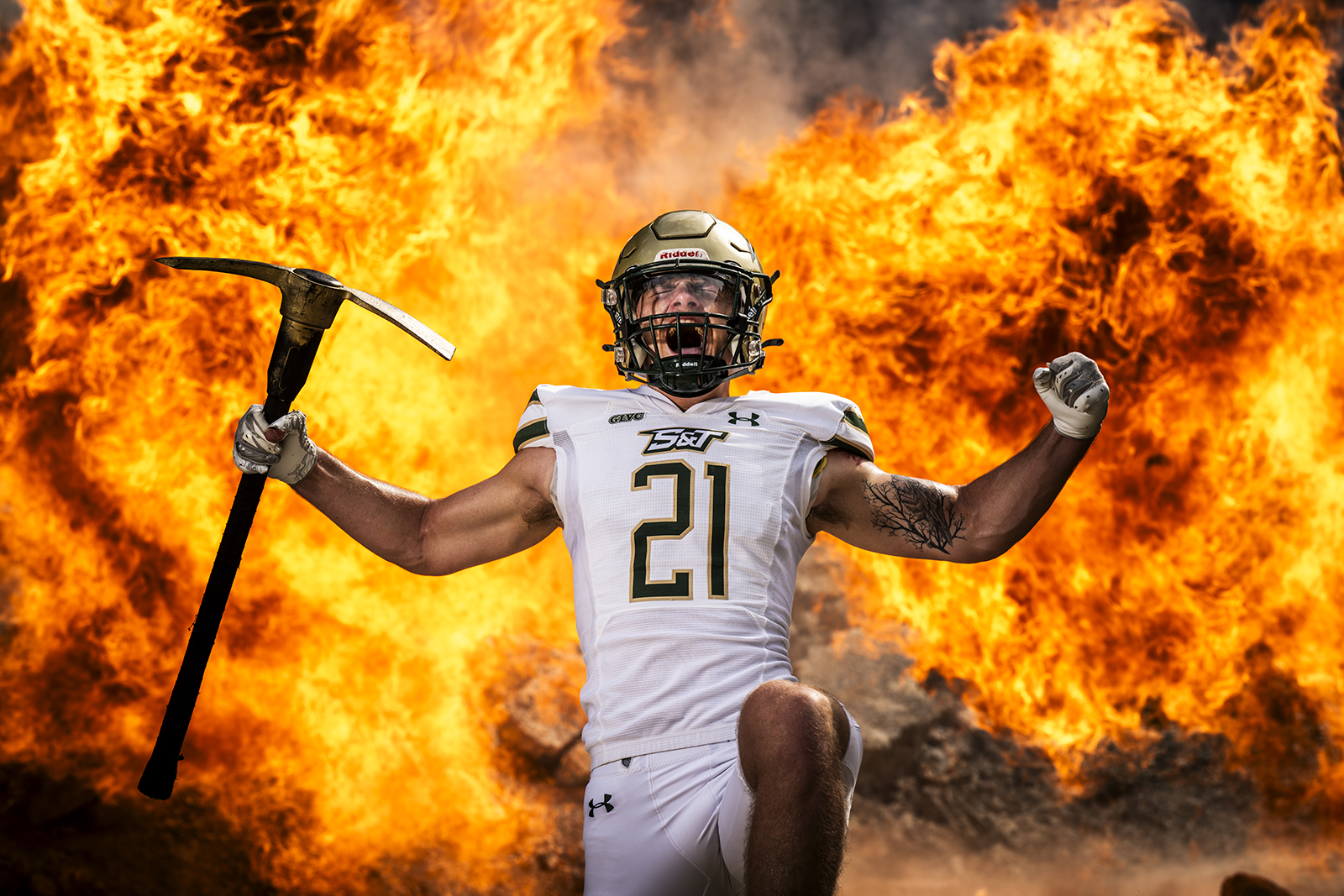 An all-conference linebacker, Cameron brings the boom on and off the field as a 4.0 student majoring in mining and explosives engineering. He's also a huge Game of Thrones fan (arm tattoo) and loved the look of summoning fire and the experience of the photos.
