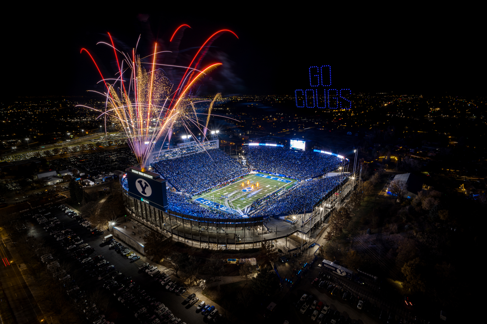 Aerial drone shot at runout at football game. 2 different images of fireworks composited together.