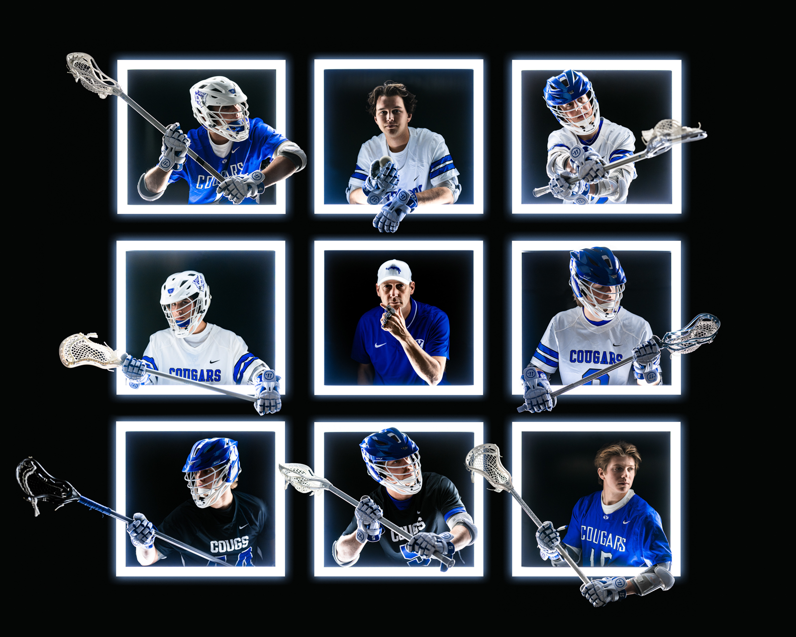 Marketing imagery for Extramural Men's Lacrosse Team. I photoshopped 9 images together to make the grid. I photoshopped out all of the light stands. The white squares are made from overlapping light bars. Any part of the light bar that went outside the square I photoshopped off.