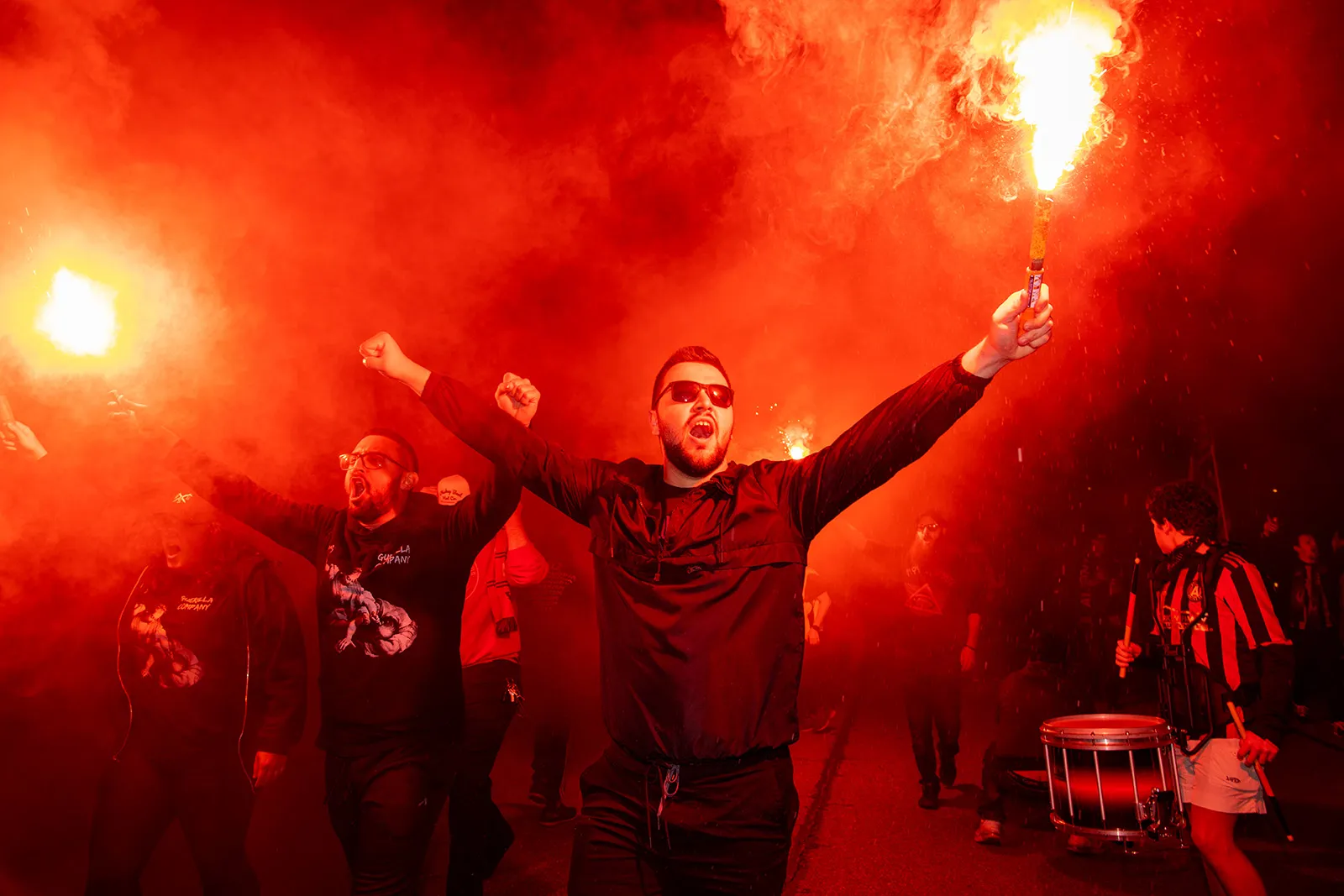 Atlanta United fans hold red flares as the supporters section march to Fifth Third Bank Stadium before Atlanta United's match against Motagua in the second leg of the Concacaf Champions League match Tuesday February 25, 2020, in Kennesaw, Ga.