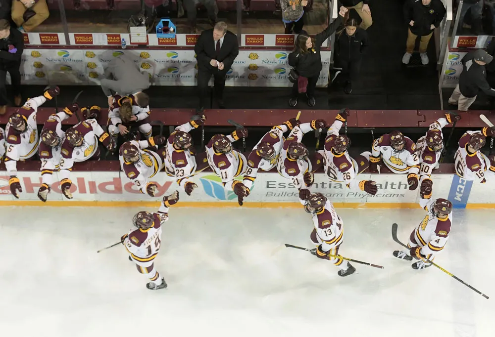 UMD men's hockey players celebrate a goal by Justin Richards (19).