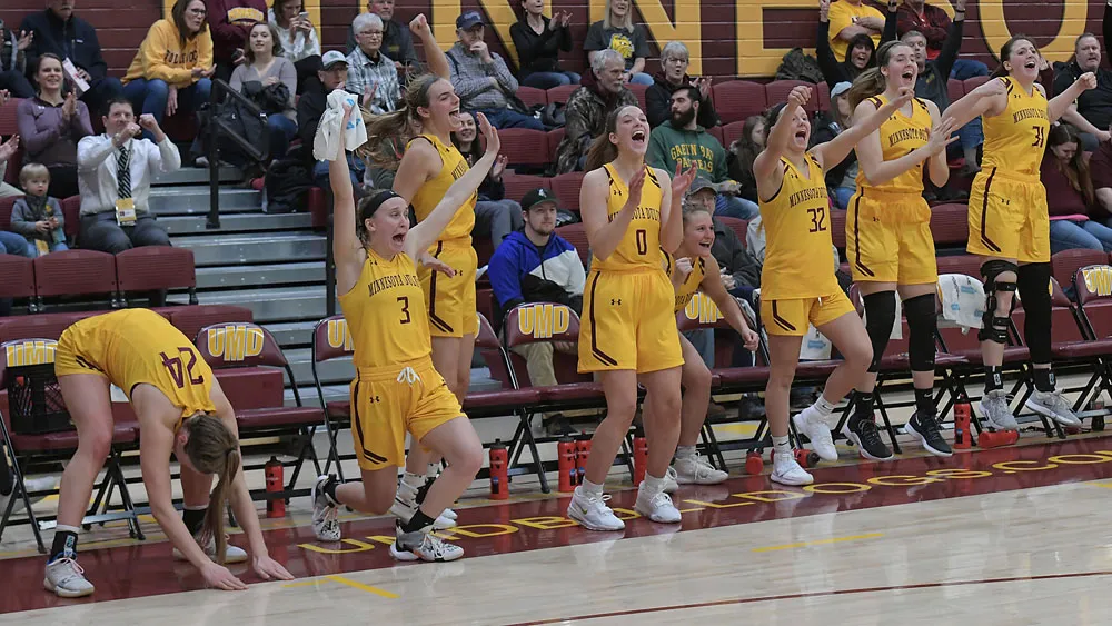 Members of the UMD women's basketball team celebrate their OT win over Upper Iowa to keep their home record perfect for the season.