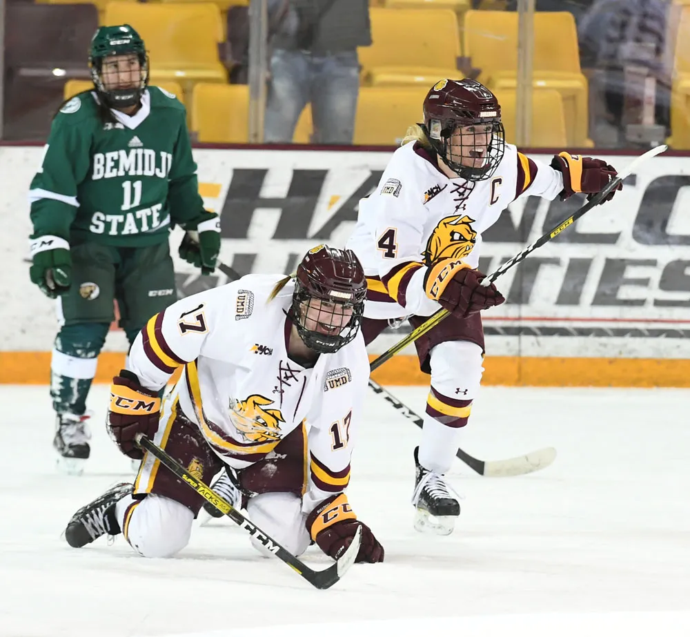UMD players Sara Hughes (17) and Sydney Brodt celebrate their teammates OT goal over Bemidji State Feb. 28, 2020.