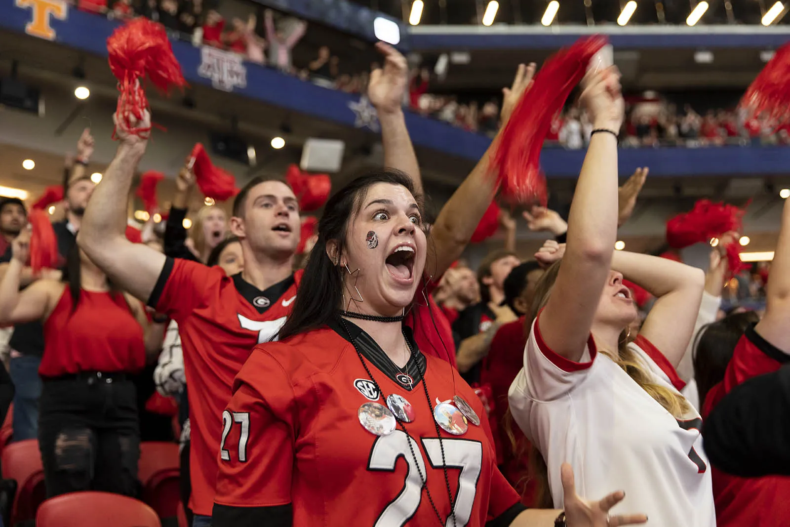 Georgia students react to the Bulldogs play on the field during the first quarter of the SEC Championship Game.