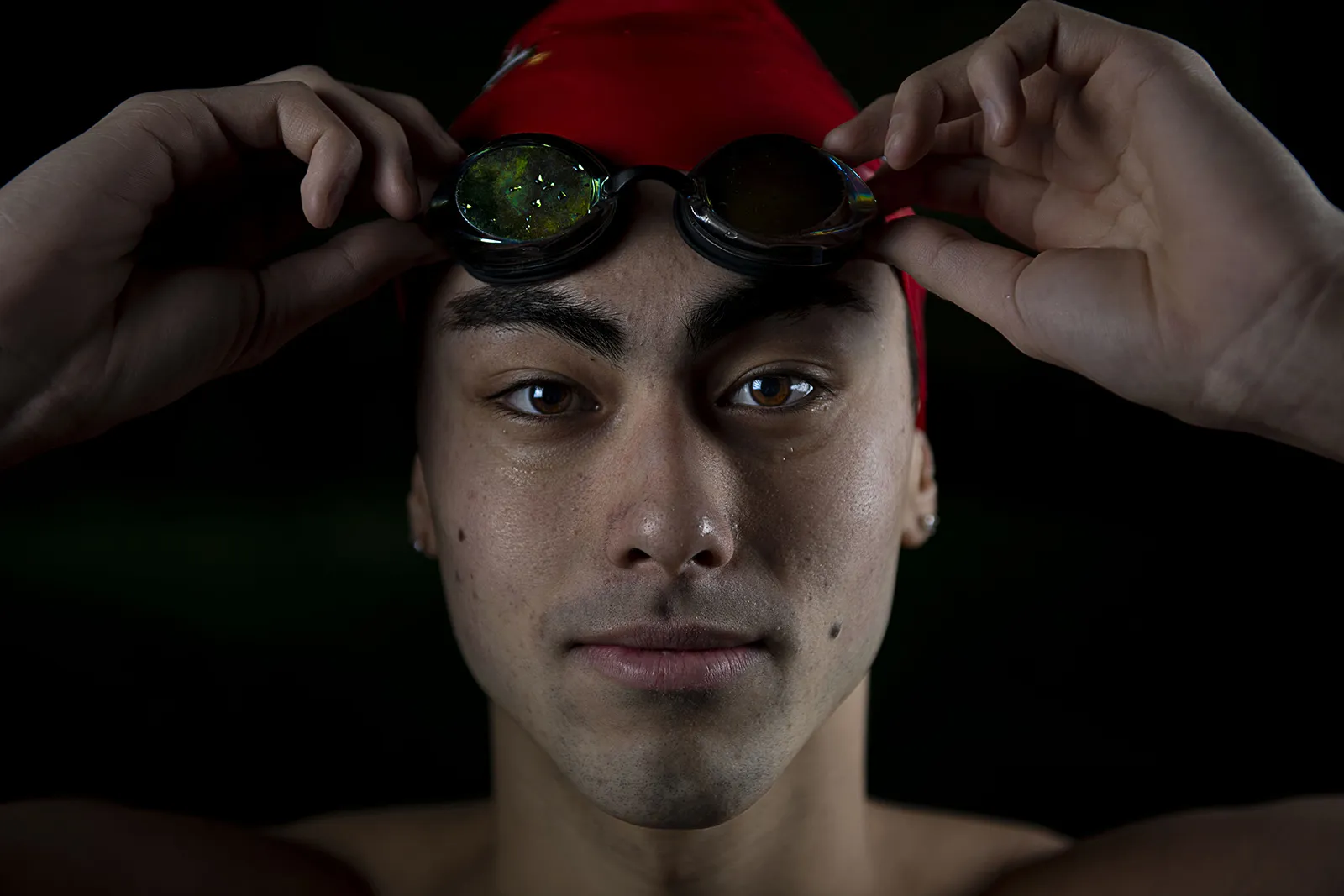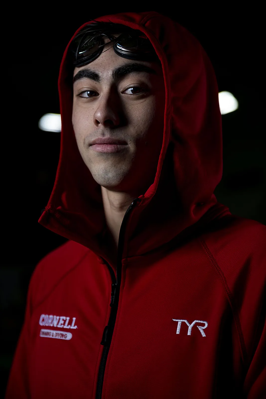 Cornell University freshman phenom Paige daCosta puts his swim goggles on during a recent portrait session in Teagle Pool after breaking two school records. daCosta is a Livermore, CA native and is already making waves on the East Coast during his first Ivy League season in the pool.