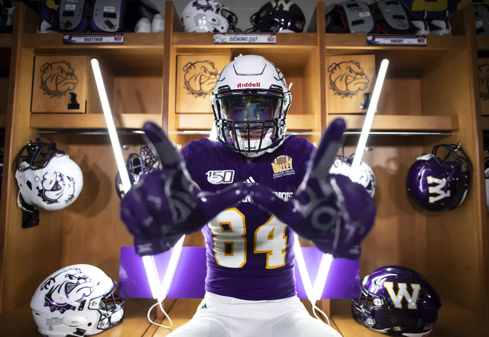 A football recruit poses for a promotion photo in the football locker room.
