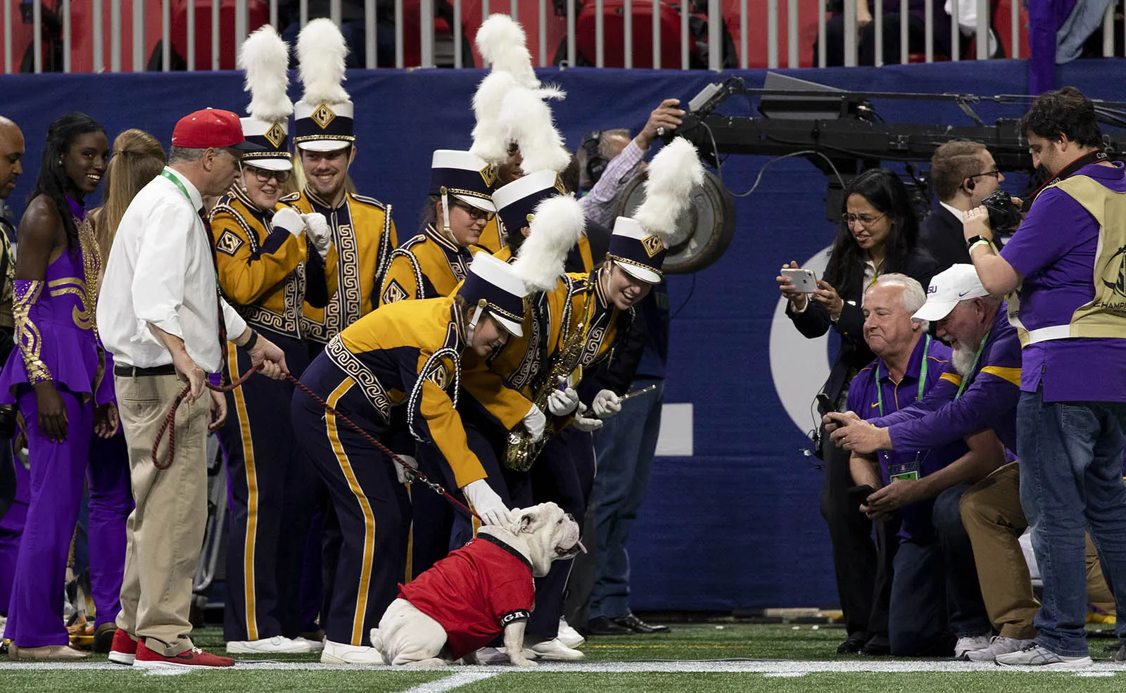 The Georgia Bulldogs' mascot, Uga X, draws attention even from the LSU band as they take photos with him during their break at halftime of the SEC Championship Game.