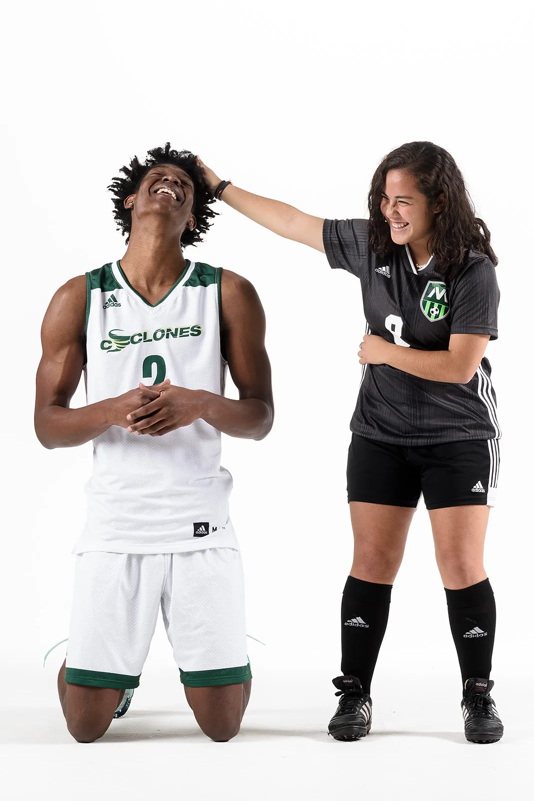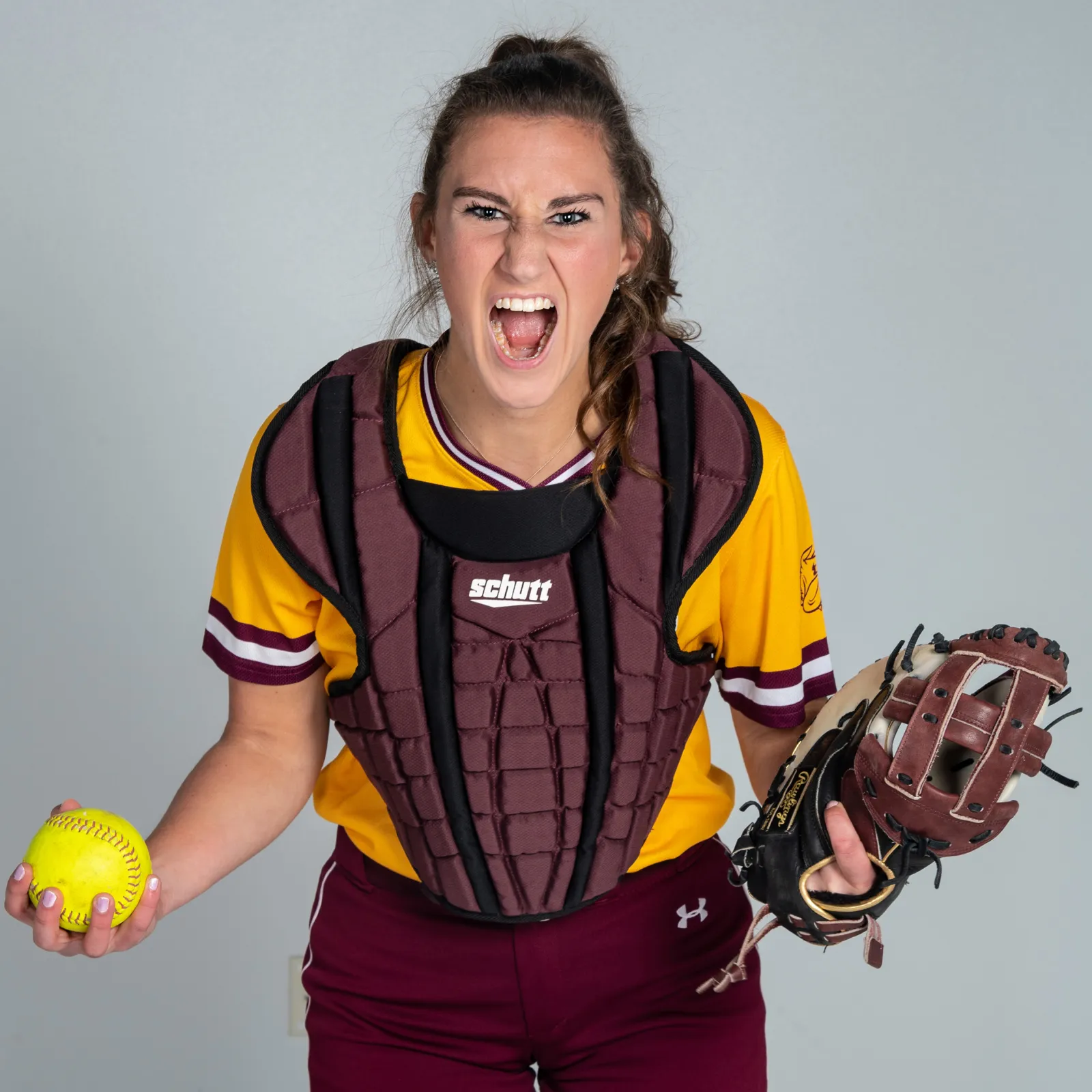 Softball catcher Hannah Bloch shows off her celebration moves during a studio poster session.