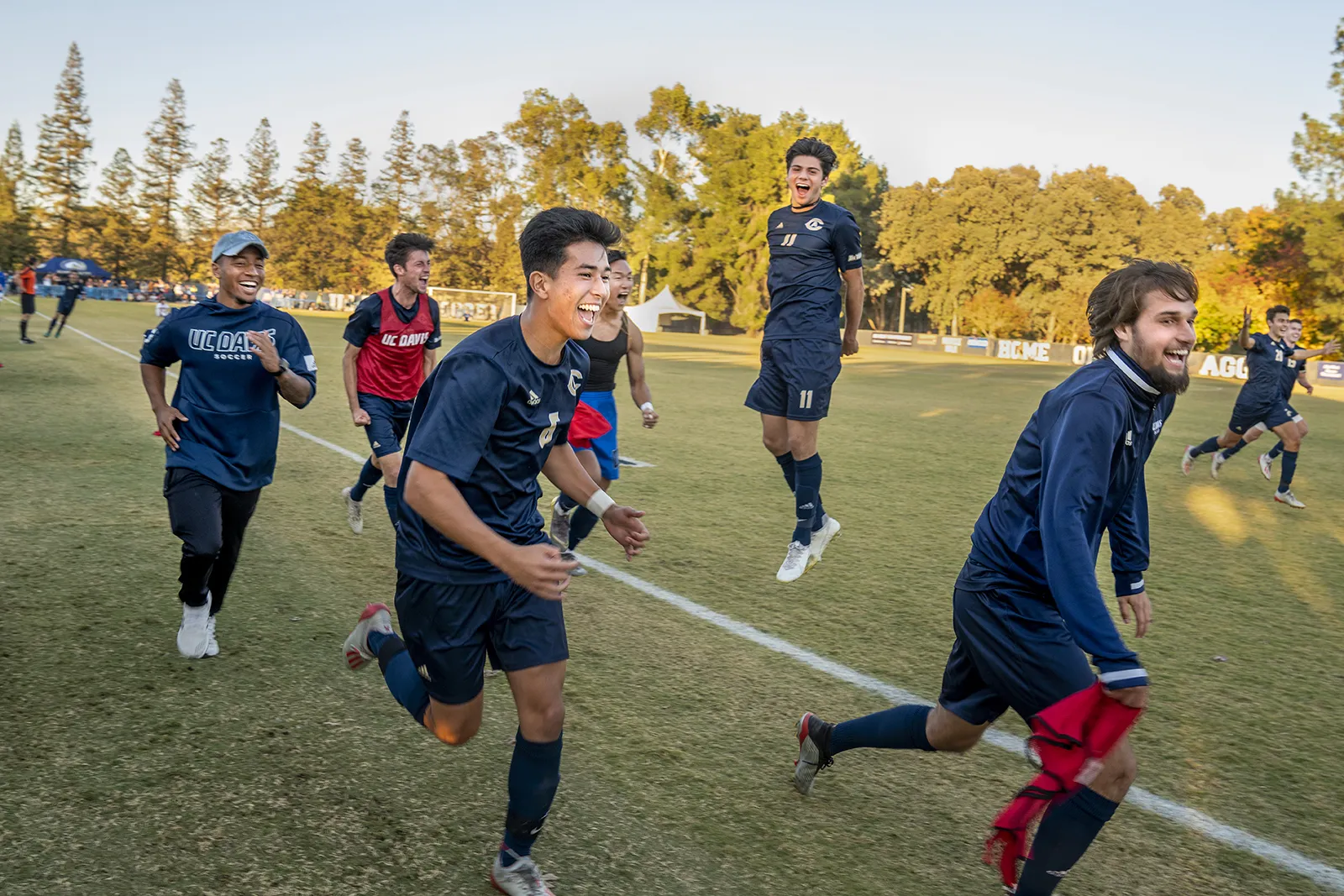 The Aggie sideline reacts to a last minute break-away goal against UC Santa Barbara to clinch the Big West conference title on November 15, 2019.