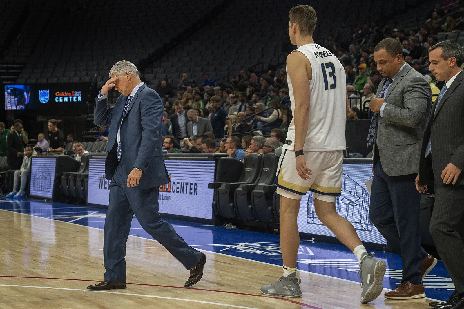 UC Davis Men's basketball coach Jim Les reacts to a tough loss to Sacramento State at The Golden One Center in downtown Sacramento on November 20, 2019.