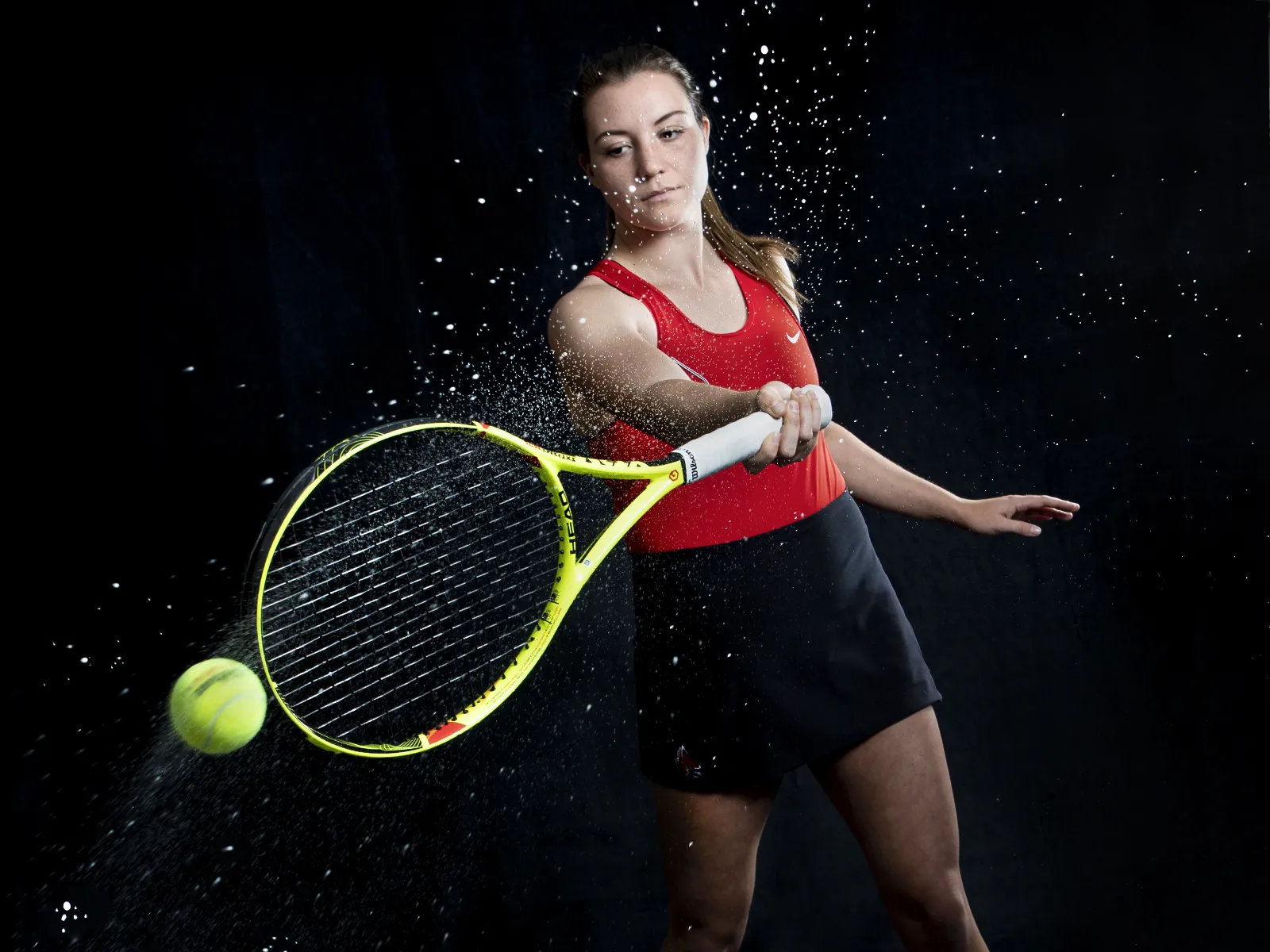 A wet tennis ball gives off a spin of water when it is hit for this promotional photo for women't tennis.