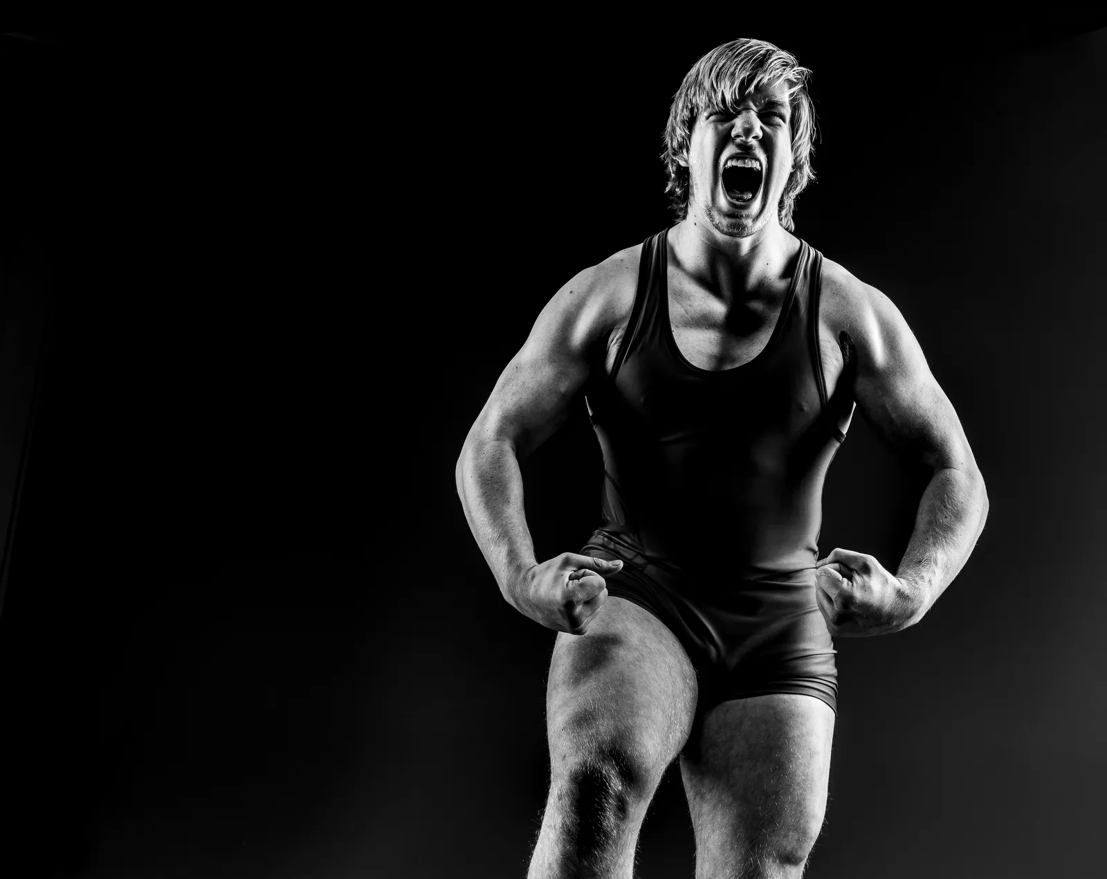 A UVU Wrestling Recruit practices his celebration in the studio
