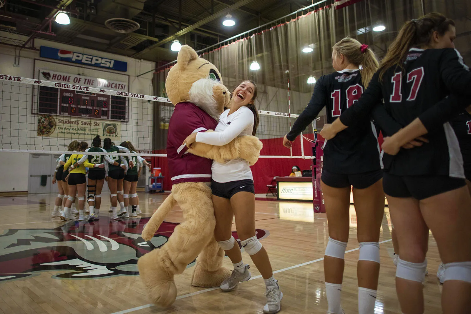 Willie The Wildcat squeezes women's volleyball player Brooke Fogel as the Wildcats prepare against the Lumberjacks before the first set of their volleyball game on Saturday, October 5, 2019.