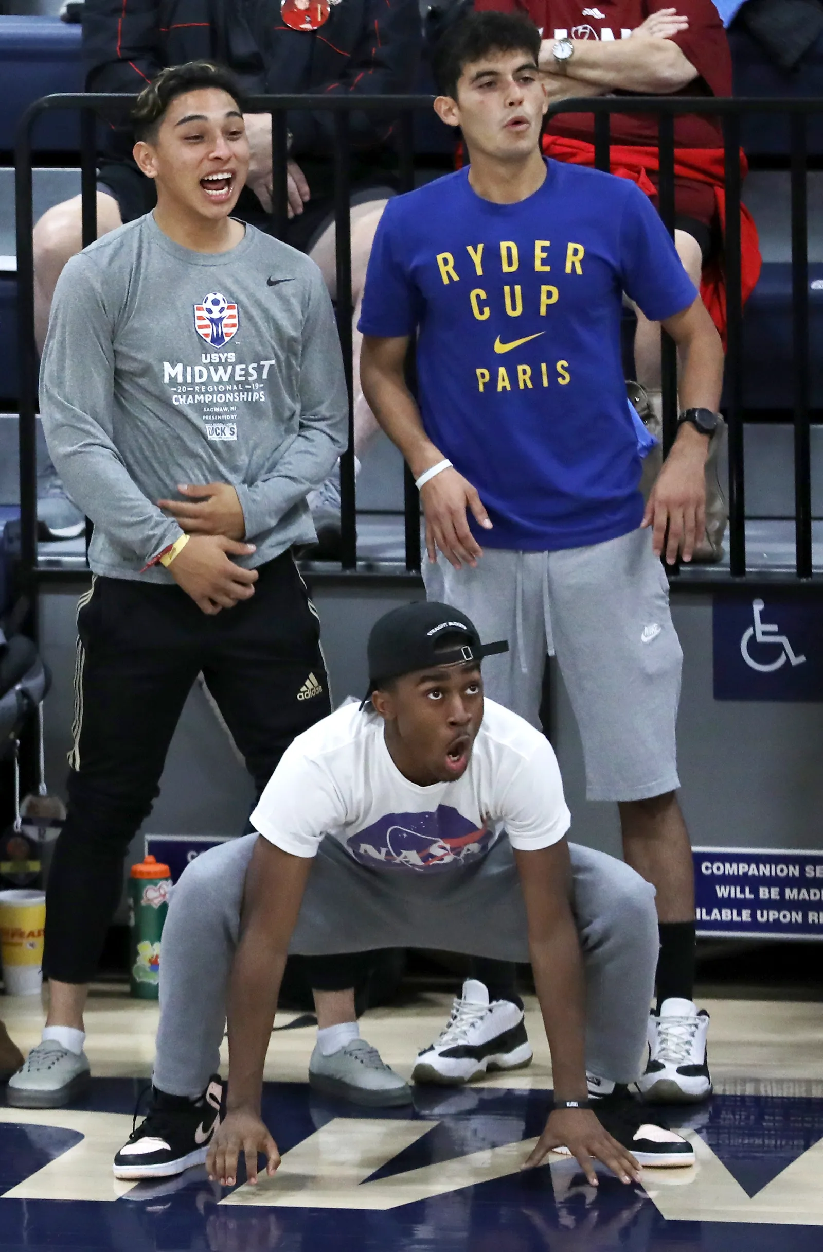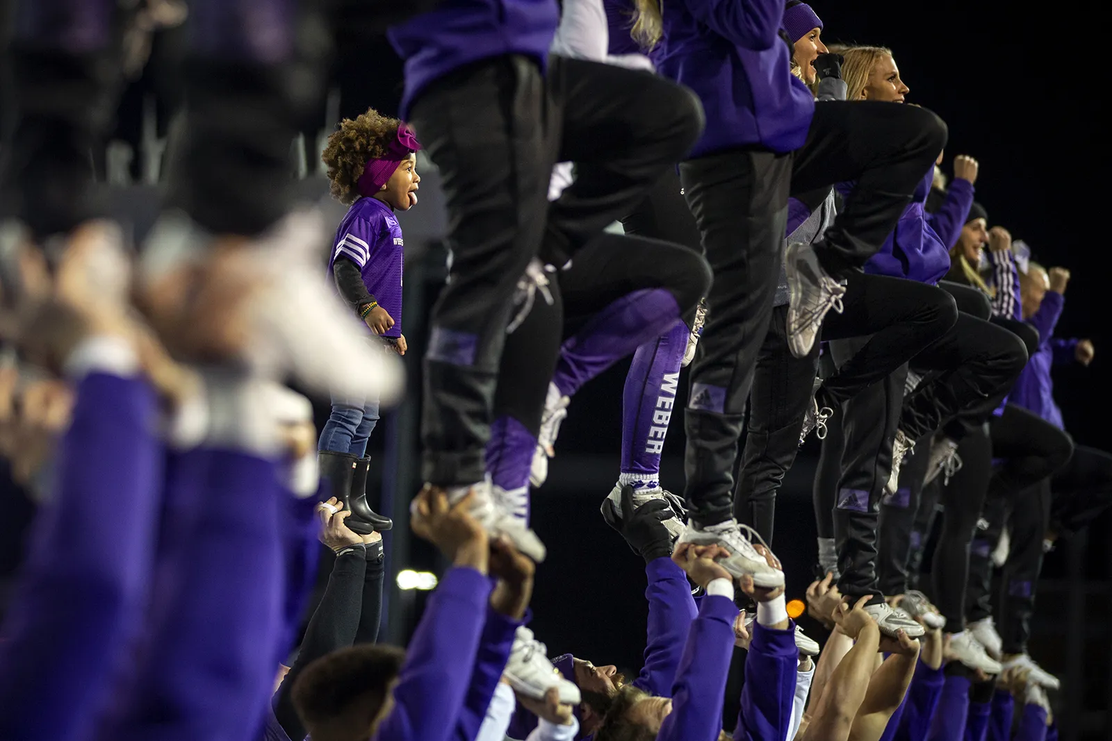 The Weber State University Spirit Squad - and a young fan - cheer during the homecoming football game on October 12, 2019.