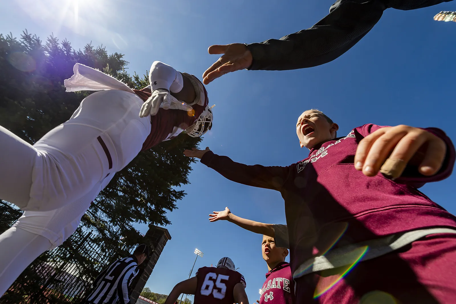 Kids line up to give high fives to Colgate Raider football players as they make their way onto the field to take on Lehigh during Colgate's homecoming weekend, October 5, 2019.