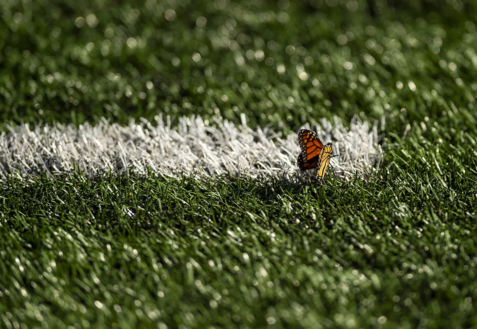 A monarch butterfly suns itself near the 30 yard marker during half time as the Colgate Raiders take on Lehigh during Colgate's homecoming weekend, October 5, 2019.