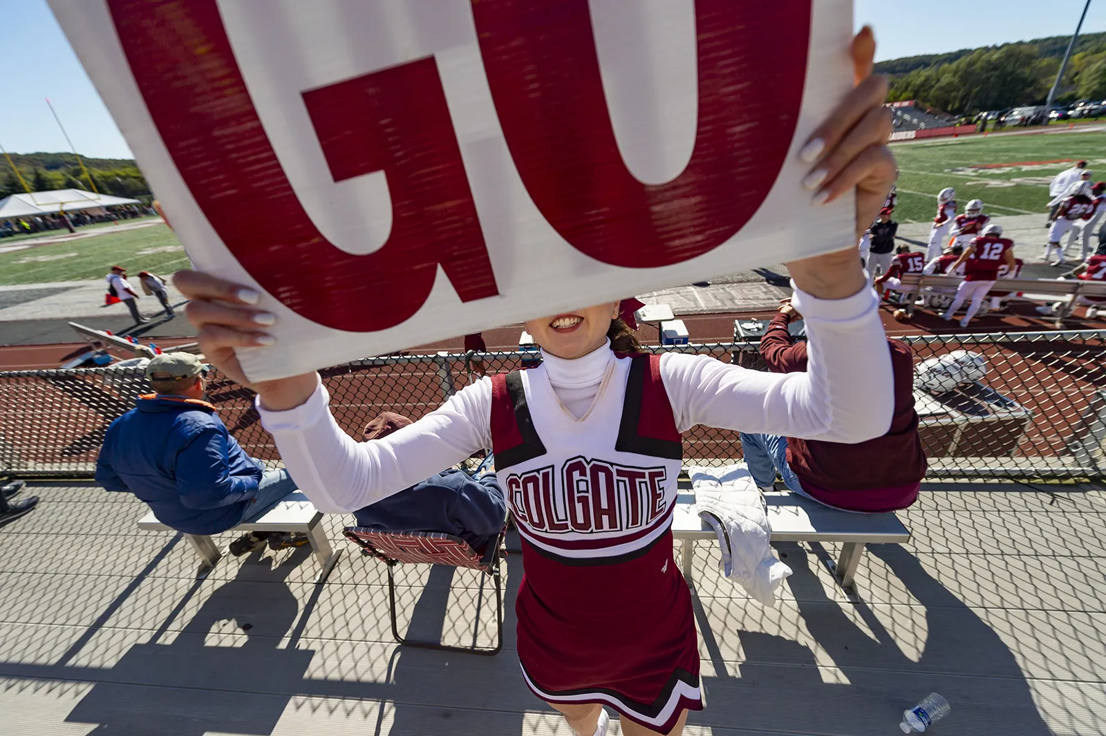 A Colgate cheerleader helps to rouse the crowd as the Colgate Raiders take on Lehigh during Colgate's homecoming weekend, October 5, 2019.