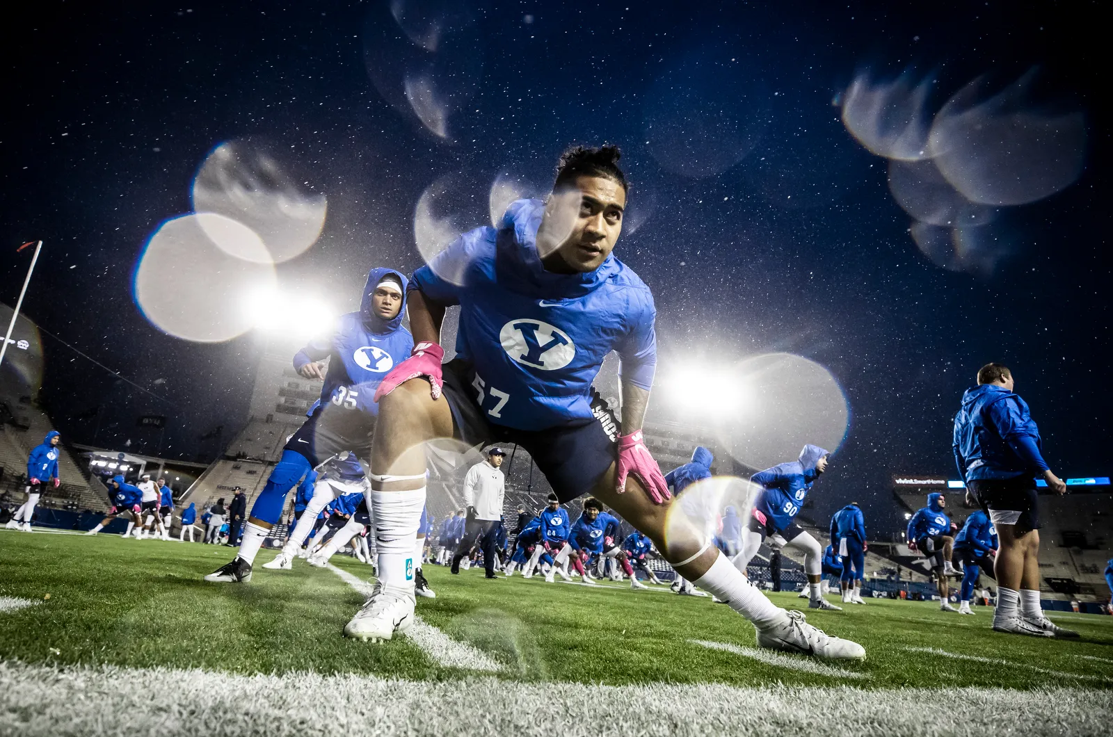 Warming up for a rivalry game vs Boise State in the cold wind and rain.