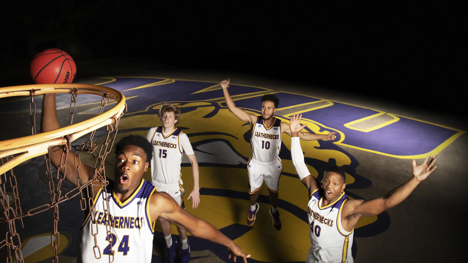 Leatherneck Men's Basketball seniors posed action on resident hall outdoor court.