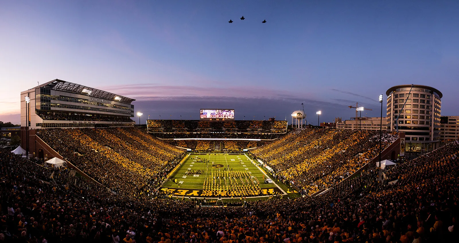A trio of F-35s, two piloted by alumni, fly over Kinnick Stadium prior to the game against Penn State. The jet missing from the formation had a mechanical problem and could not fly.