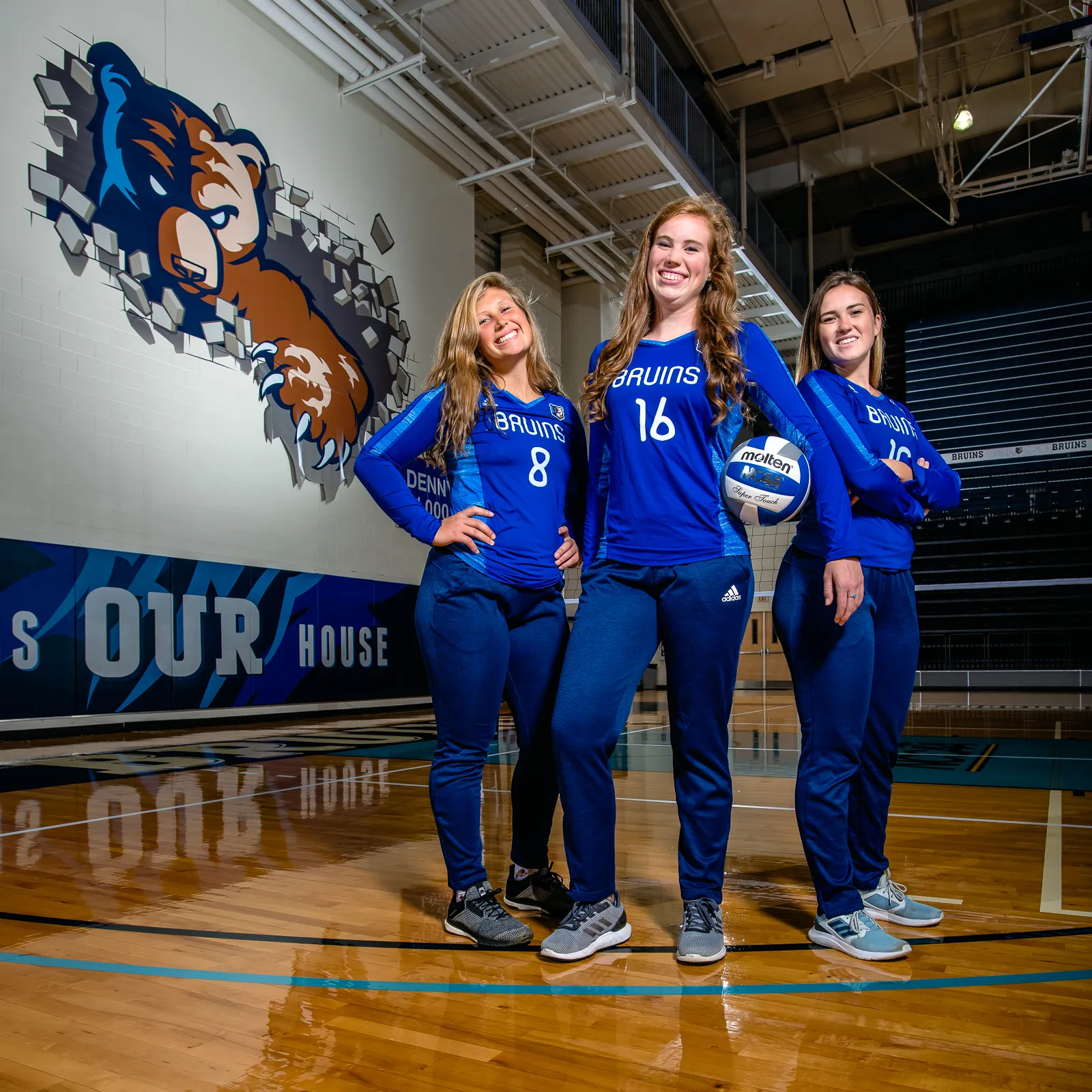 Group photo on the volleyball court of the women's volleyball senior class.