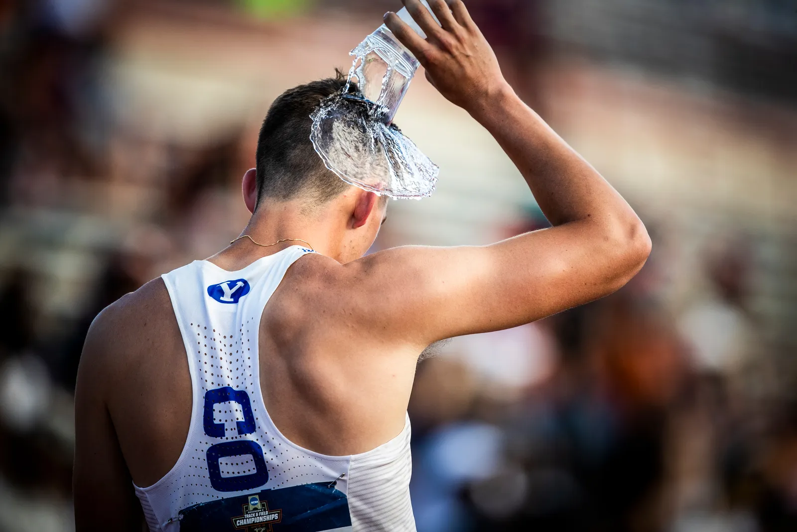 Decathlete Brian Matthews pours water on his head after an event at the NCAA Track and Field Championship meet in Austin, TX.