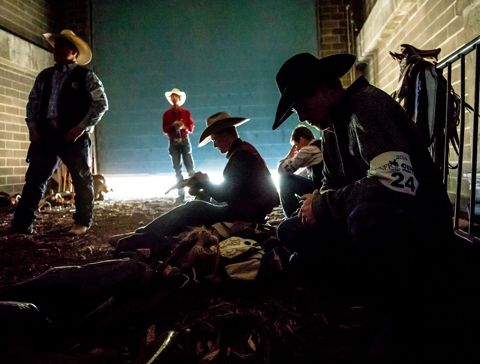 Saddle bronc rider, Weston Hogan sits in the shadows as he prepares for his first ride at the College National Finals Rodeo in Casper, Wyoming. Hogan, a senior, did not score high enough to advance to the short-go.
