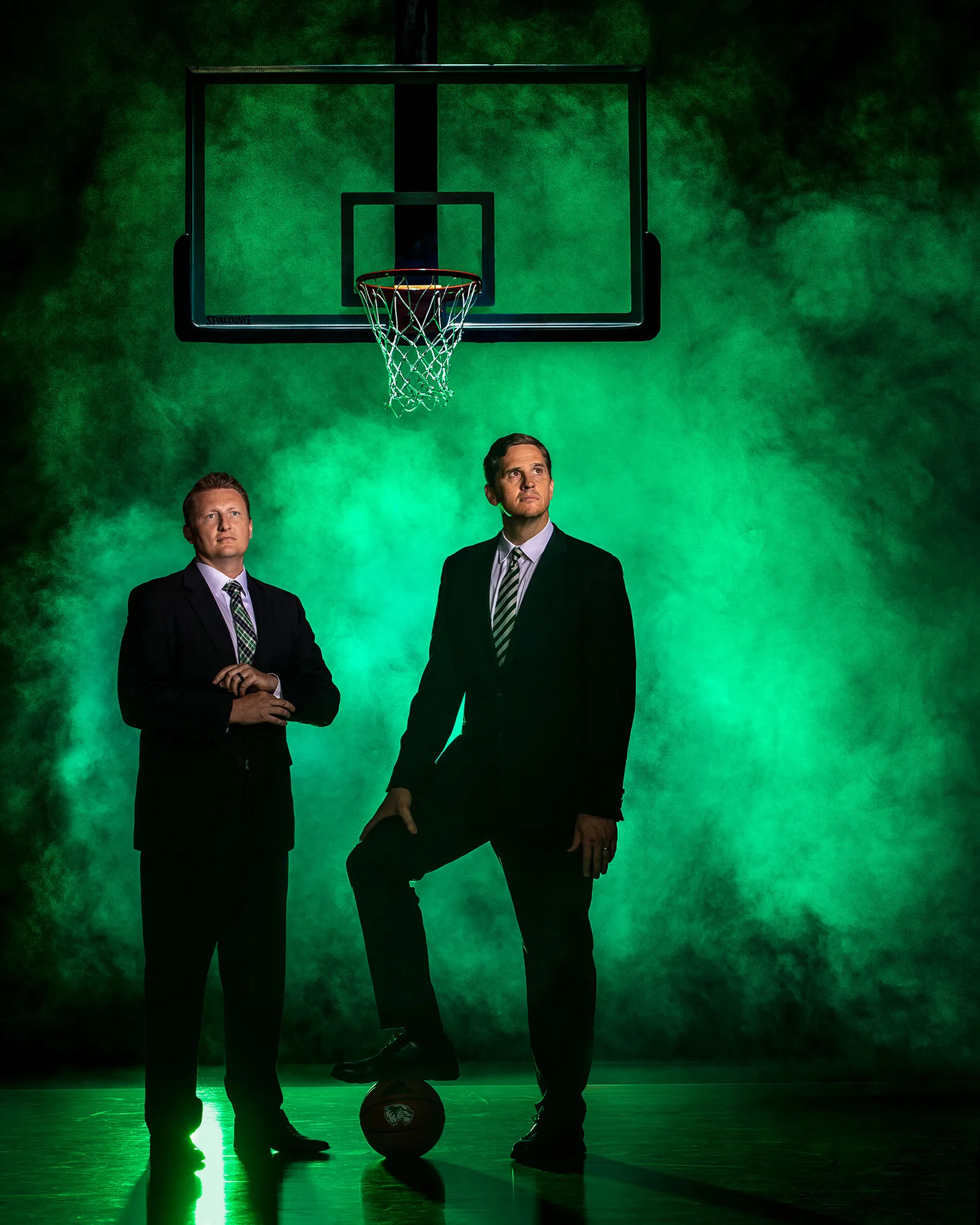 Both the women's and men's basketball team hired new head coaches this summer. Dan Nielsen, women's head basketball coach and Mark Madsen, men's head basketball coach pose for a portrait in the training facility. The portrait was used as the cover of the quarterly alumni magazine.