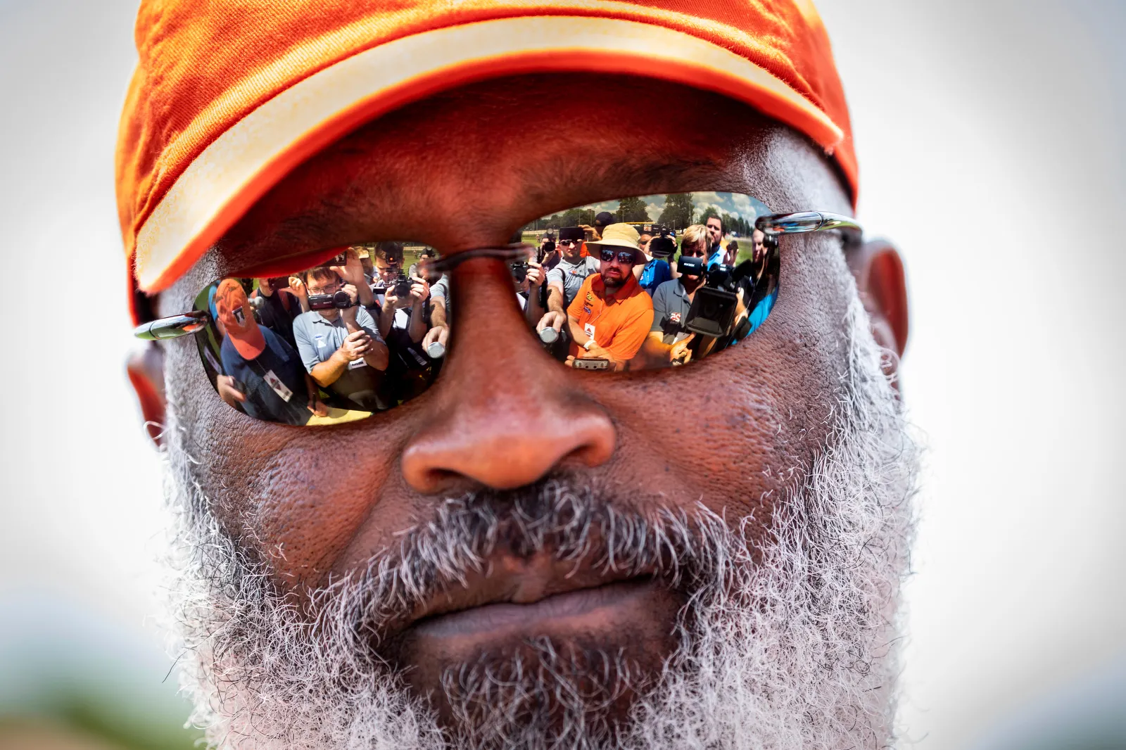 No stranger to the media, head football coach Lovie Smith is barraged with questions from a gaggle of media after practice.