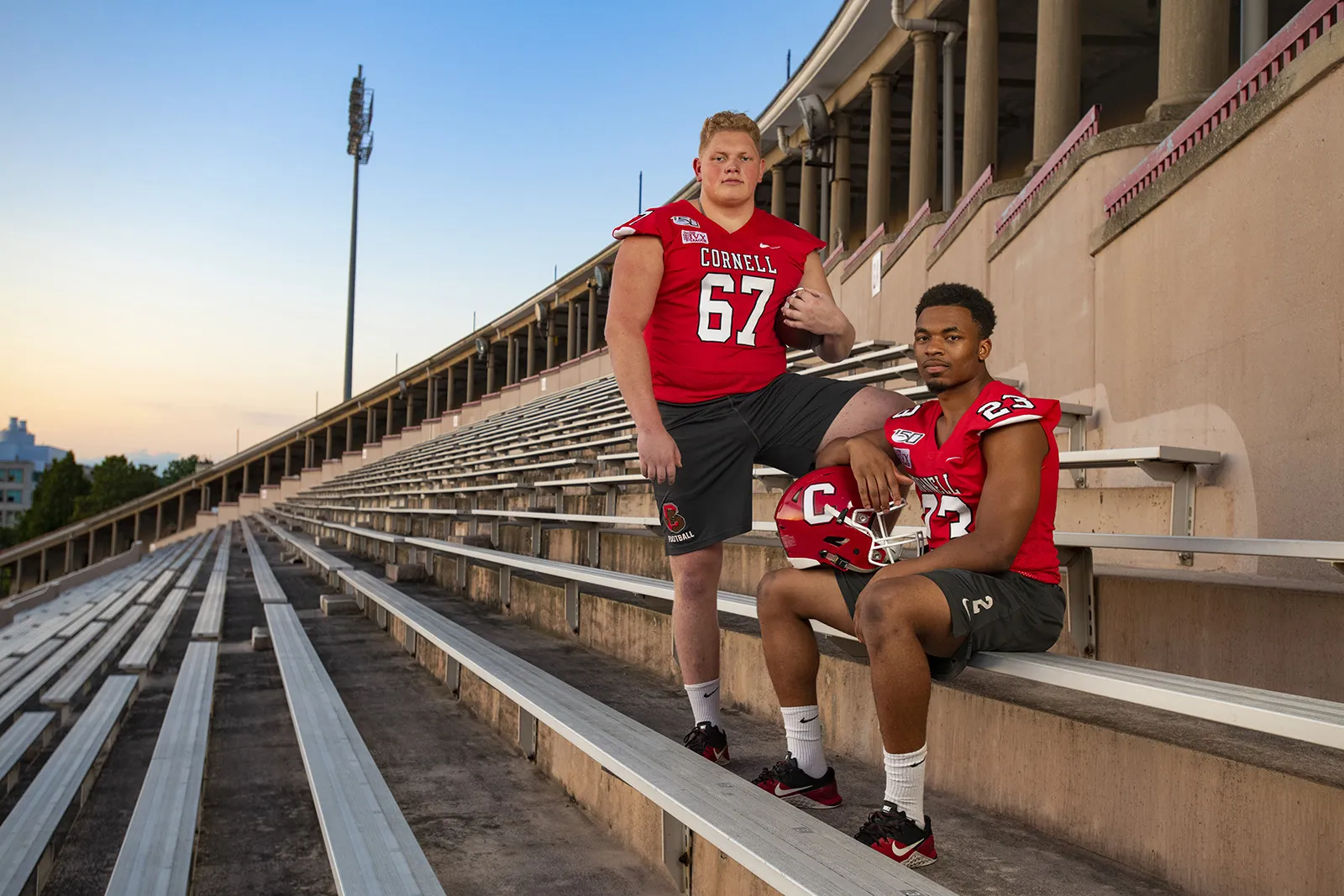 The Cornell Big Red football team announced its captains for the 2019 season in offensive lineman George Holm (standing) and defensive back Jelani Taylor. The duo, seen here in The Crescent, Cornell's football stadium, will take the field at home vs Georgetown on Oct. 5, 2019.