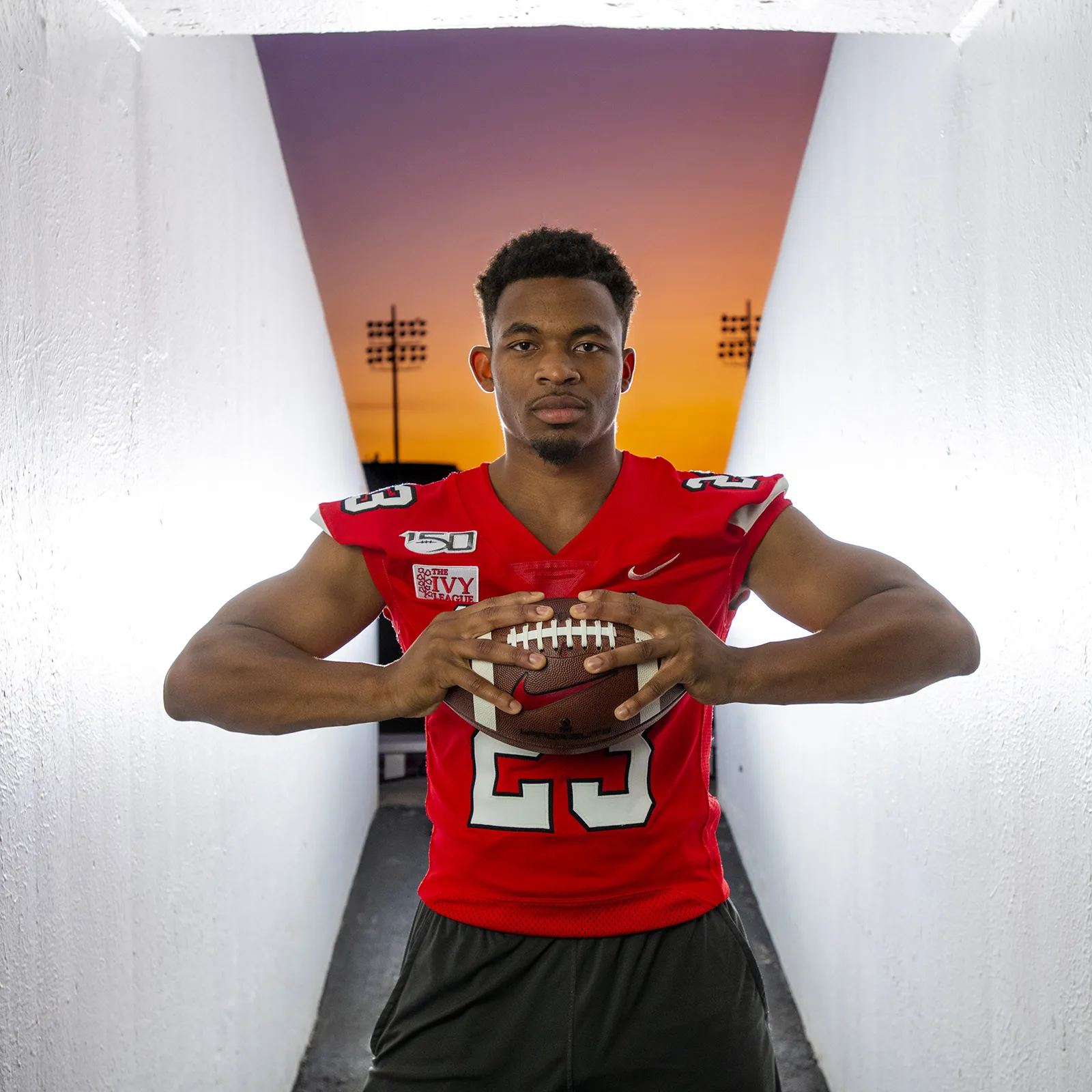 Cornell Big Red football captain Jelani Taylor poses in the hallway of The Crescent as the sun sets on Ithaca, NY and Schoellkopf Field ahead of the 2019 season.