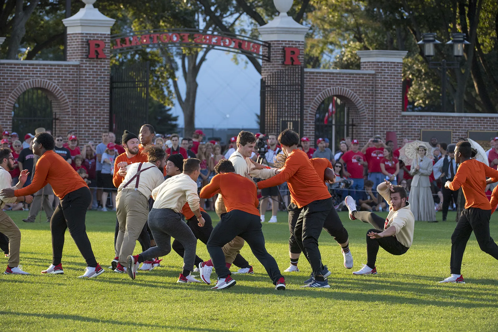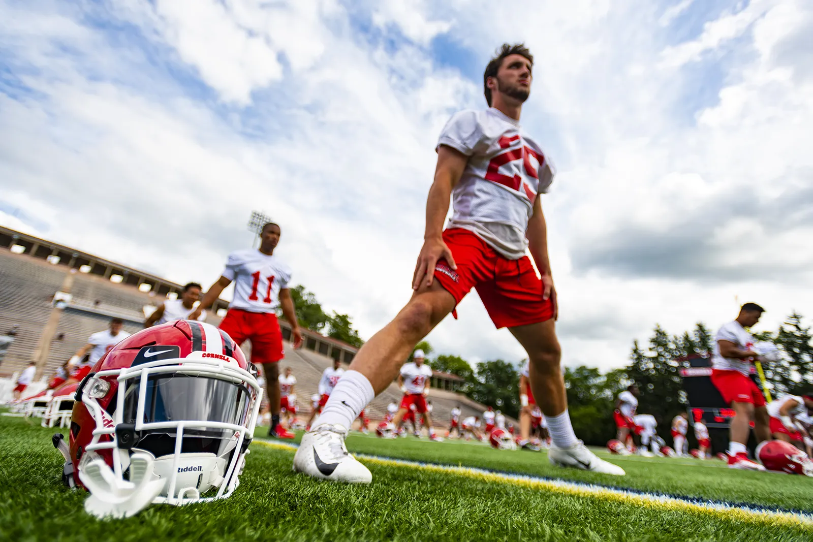 Cornell return specialist David Jones stretches next to the newly revamped Big Red helmet during the first practice of the 2019 season.