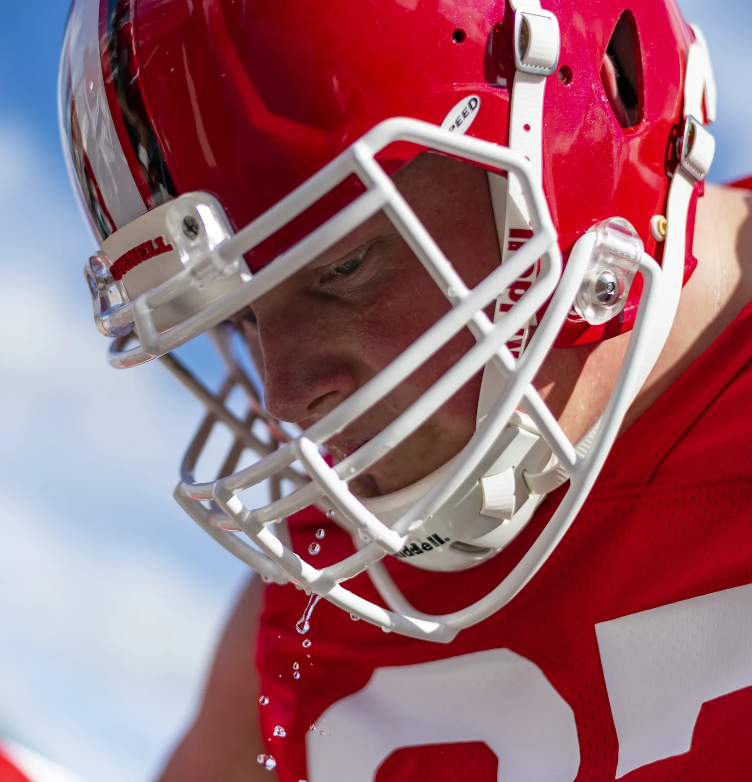Cornell Big Red captain and offensive lineman George Holm grabs a quick drink of water between drills on the first day of football practice in 2019.
