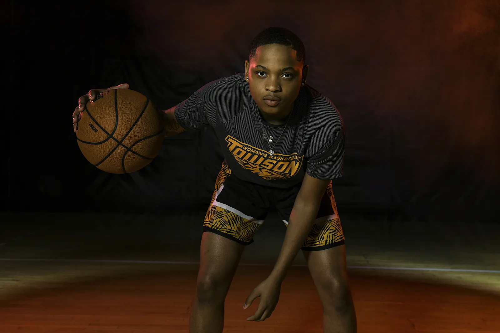 Towson University Women's Basketball player Kionna Jeter dribbles the ball for a portrait