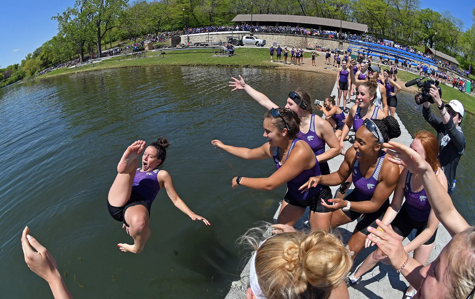 K-State throws their coxswains into the water after the Sunflower Showdown at Wyandotte County Lake in Kansas City, Kansas.