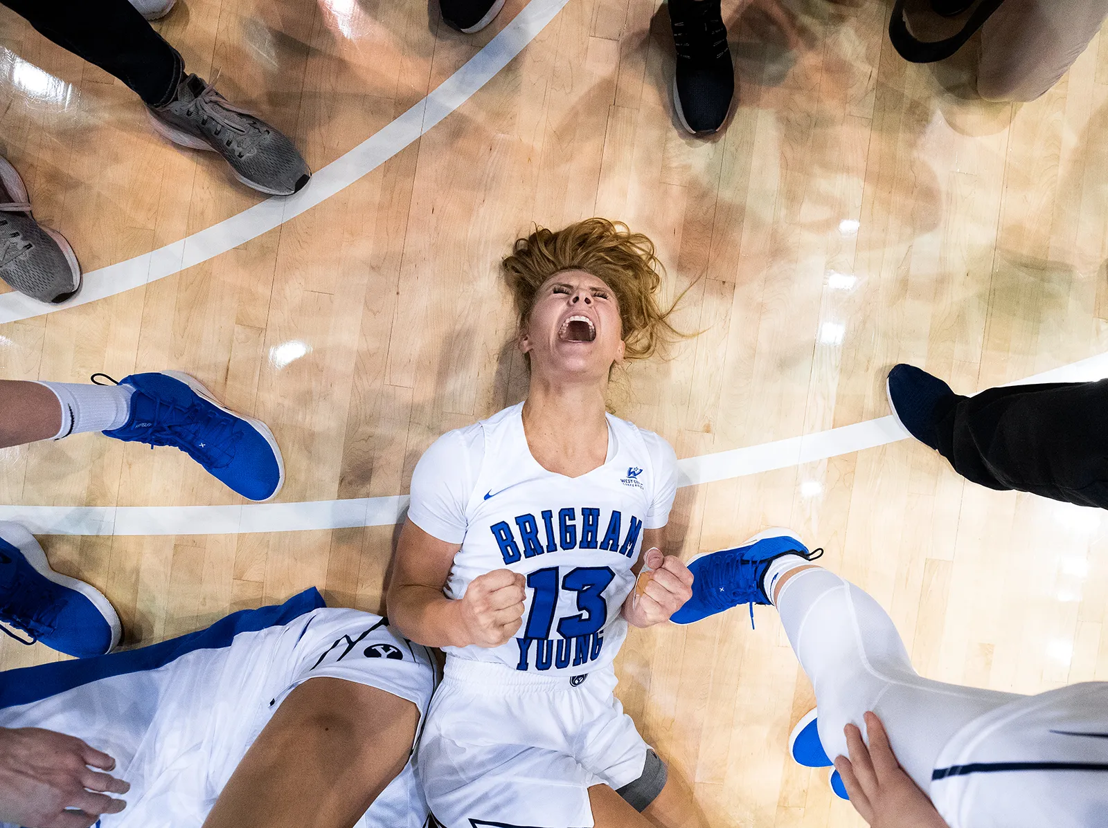 Sophomore guard Paisley Johnsen celebrates with her teammates after an victory over the 13th ranked Gonzaga Bulldogs.