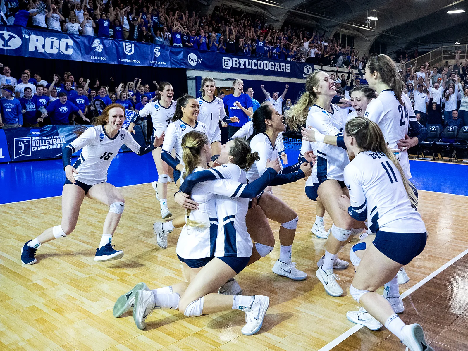 Team celebration after sweeping Texas in the Regional Finals and punching their ticket to the Final 4 in the Women's Volleyball Championships.
